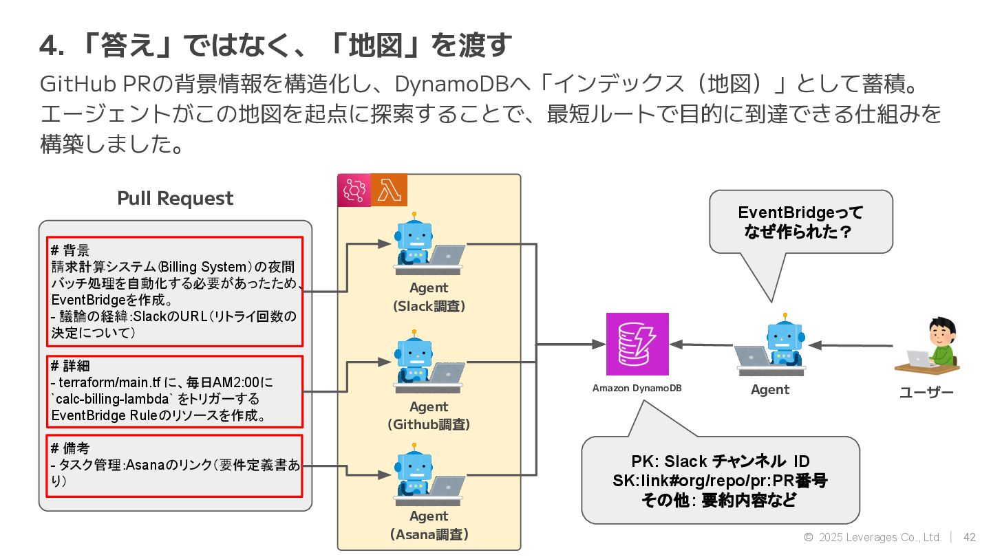42 © 2025 Leverages Co., Ltd. 4. 「答え」ではなく、「地図」を渡す GitHub PRの背景情報を構造化し、DynamoDBへ「インデックス(地図)」として蓄積。