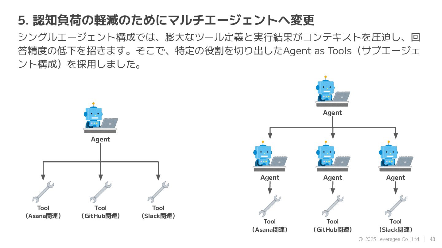 43 © 2025 Leverages Co., Ltd. 5. 認知負荷の軽減のためにマルチエージェントへ変更 シングルエージェント構成では、膨大なツール定義と実行結果がコンテキストを圧迫し、回 答精度の低下を招きます。そこで、特定の役割を切り出したAgent