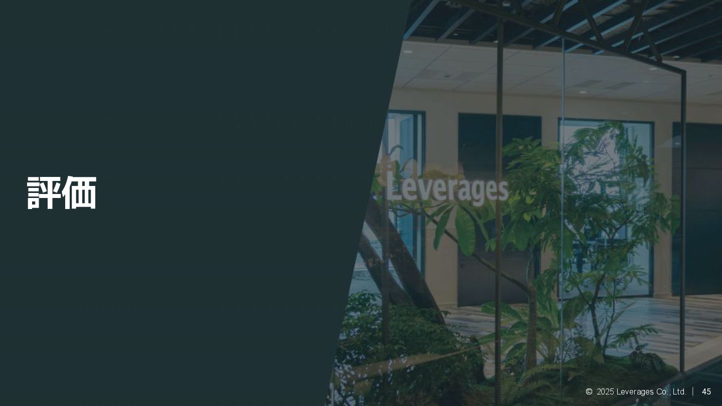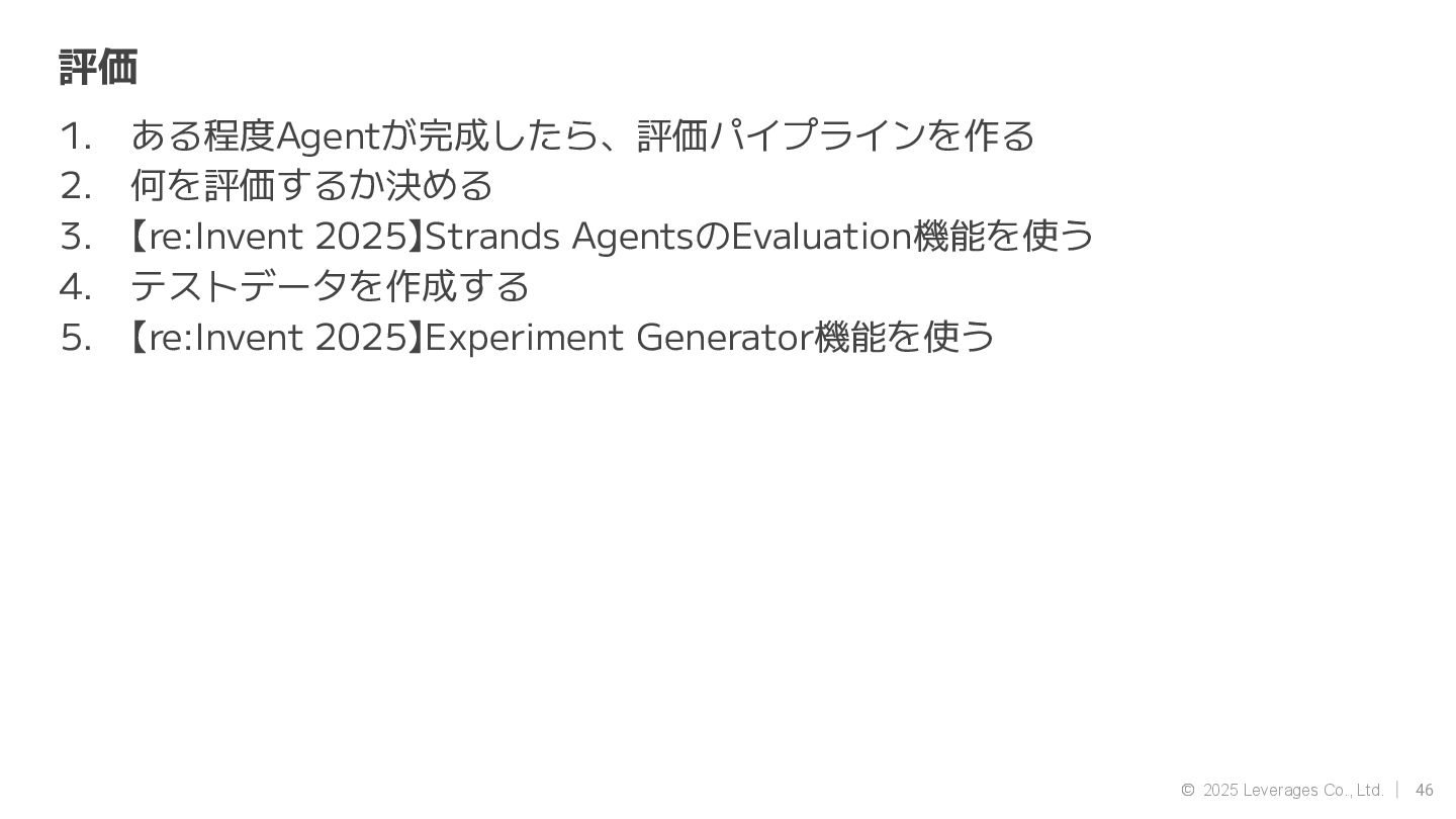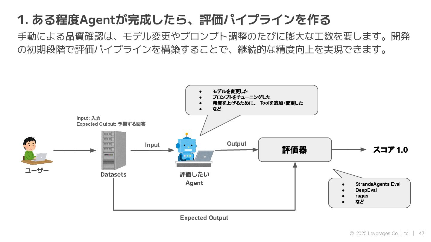 46 © 2025 Leverages Co., Ltd. 評価 1. ある程度Agentが完成したら、評価パイプラインを作る 2.