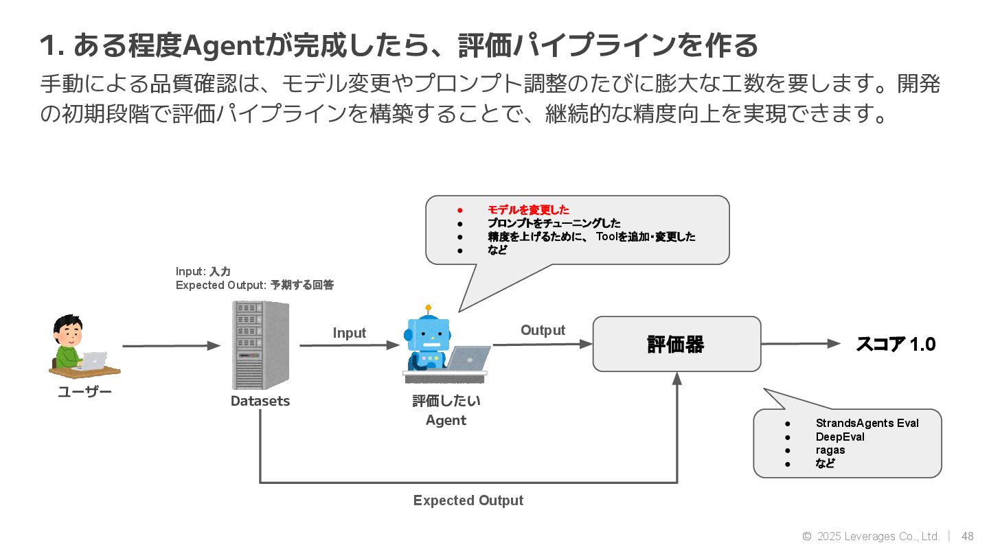 47 © 2025 Leverages Co., Ltd. 1. ある程度Agentが完成したら、評価パイプラインを作る 手動による品質確認は、モデル変更やプロンプト調整のたびに膨大な工数を要します。開発 の初期段階で評価パイプラインを構築することで、継続的な精度向上を実現できます。
