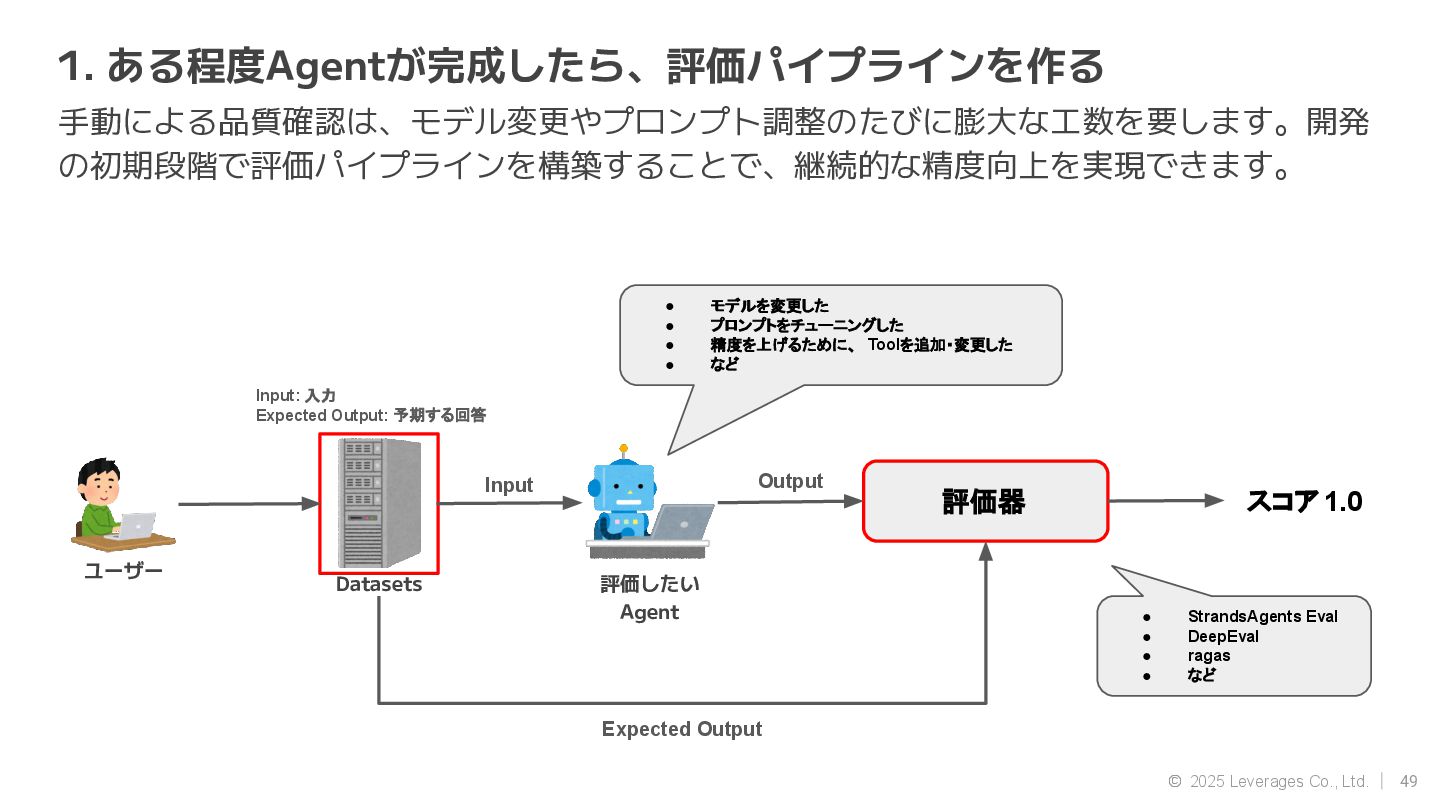 48 © 2025 Leverages Co., Ltd. 1. ある程度Agentが完成したら、評価パイプラインを作る 手動による品質確認は、モデル変更やプロンプト調整のたびに膨大な工数を要します。開発 の初期段階で評価パイプラインを構築することで、継続的な精度向上を実現できます。