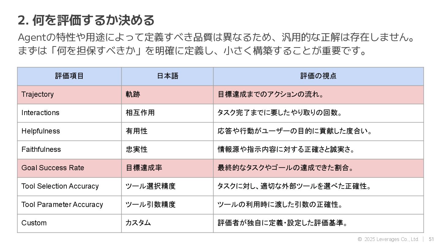 50 © 2025 Leverages Co., Ltd. 2. 何を評価するか決める Agentの特性や用途によって定義すべき品質は異なるため、汎用的な正解は存在しません。 まずは「何を担保すべきか」を明確に定義し、小さく構築することが重要です。