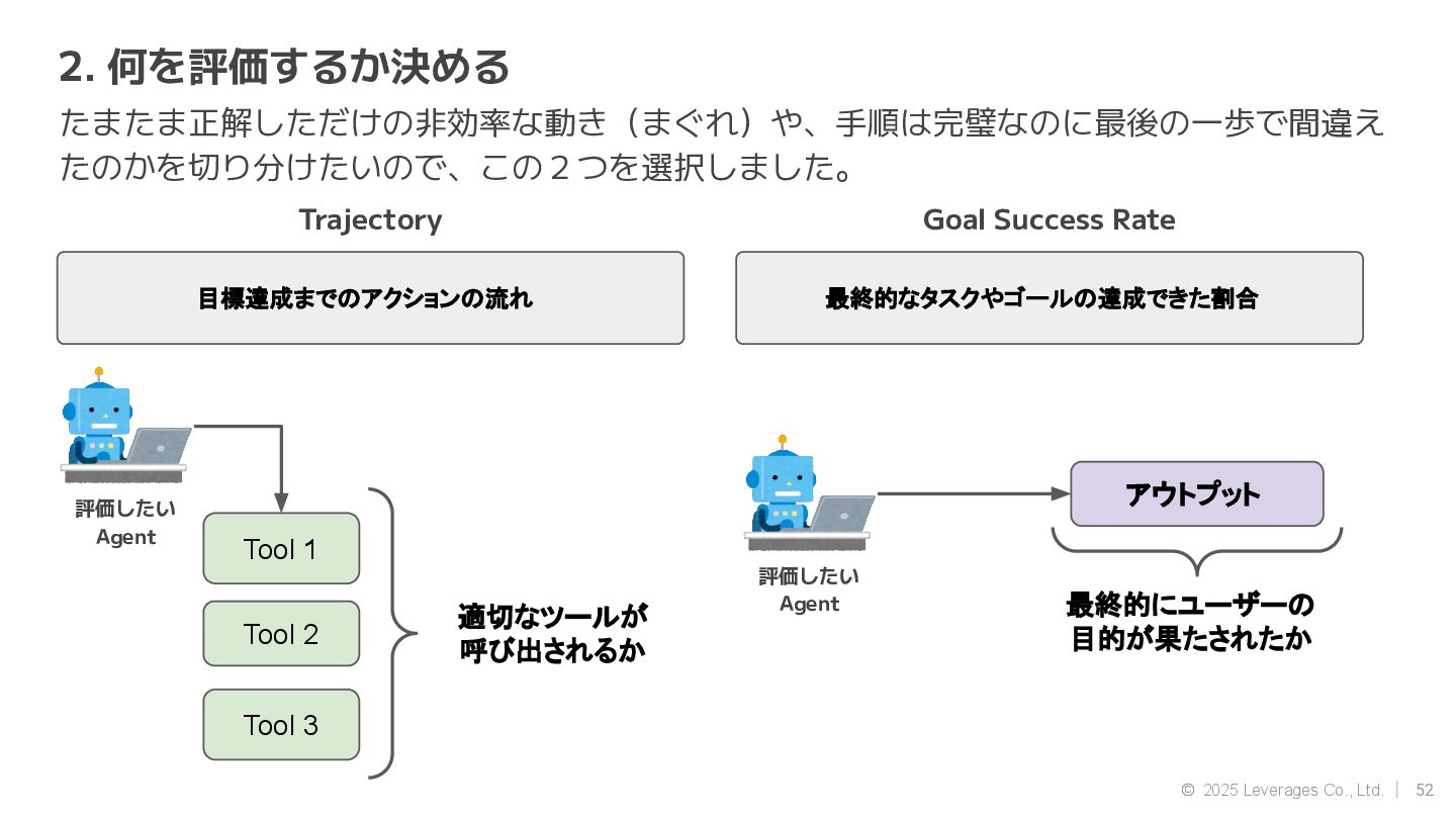 51 © 2025 Leverages Co., Ltd. 2. 何を評価するか決める Agentの特性や用途によって定義すべき品質は異なるため、汎用的な正解は存在しません。 まずは「何を担保すべきか」を明確に定義し、小さく構築することが重要です。