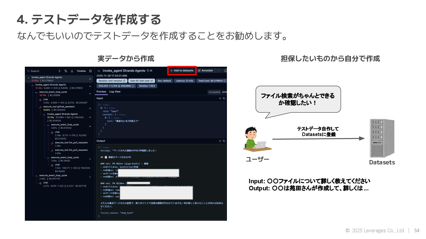 54 © 2025 Leverages Co., Ltd. なんでもいいのでテストデータを作成することをお勧めします。 4. テストデータを作成する 実データから作成
