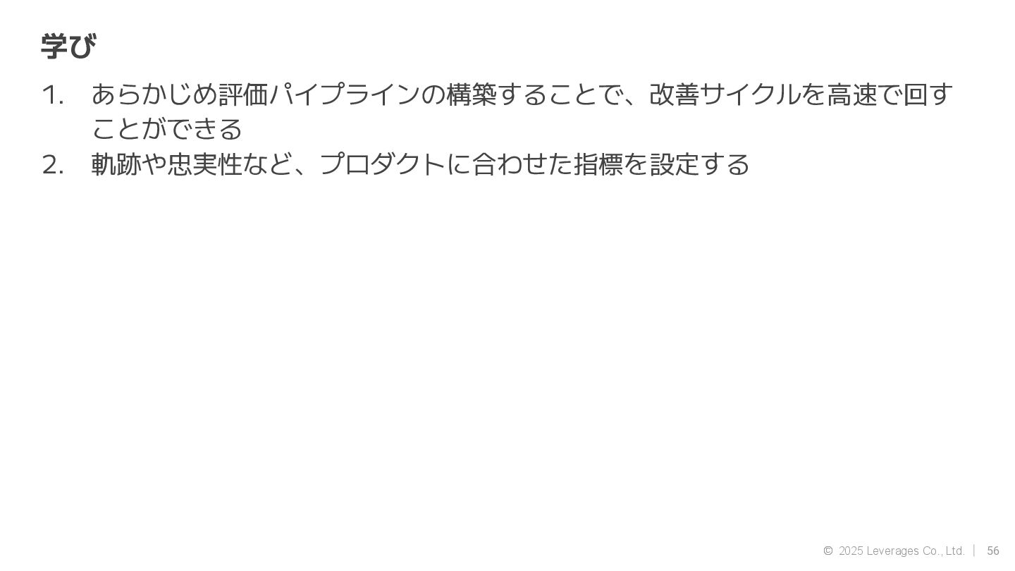 56 © 2025 Leverages Co., Ltd. 学び 1. あらかじめ評価パイプラインの構築することで、改善サイクルを高速で回す ことができる