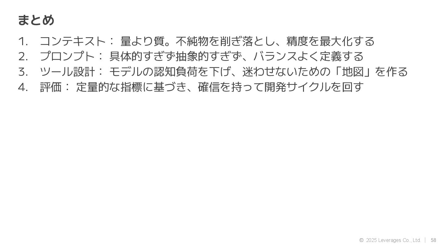 58 © 2025 Leverages Co., Ltd. まとめ 1. コンテキスト: 量より質。不純物を削ぎ落とし、精度を最大化する