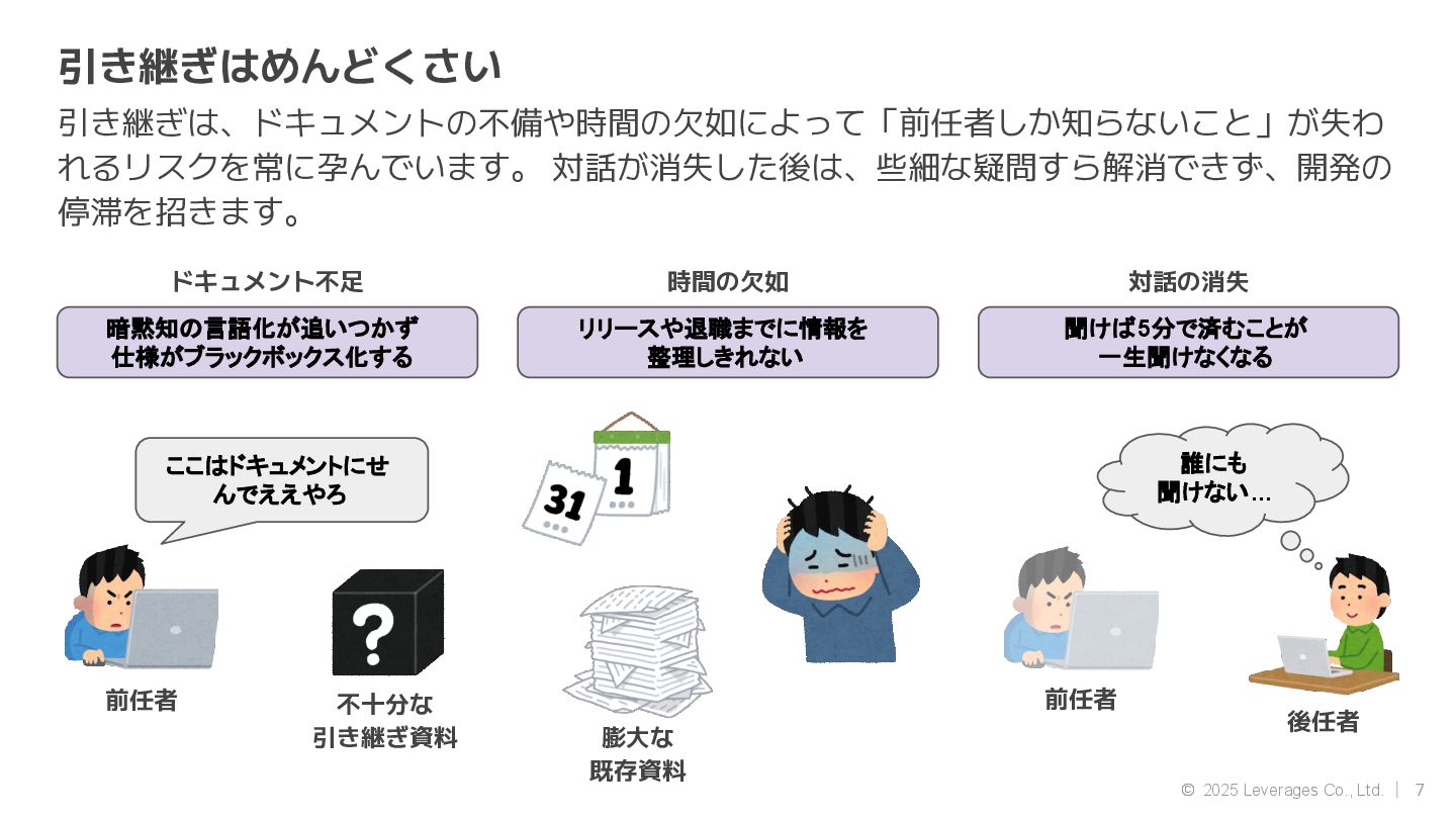 7 © 2025 Leverages Co., Ltd. 引き継ぎはめんどくさい 引き継ぎは、ドキュメントの不備や時間の欠如によって「前任者しか知らないこと」が失わ れるリスクを常に孕んでいます。 対話が消失した後は、些細な疑問すら解消できず、開発の