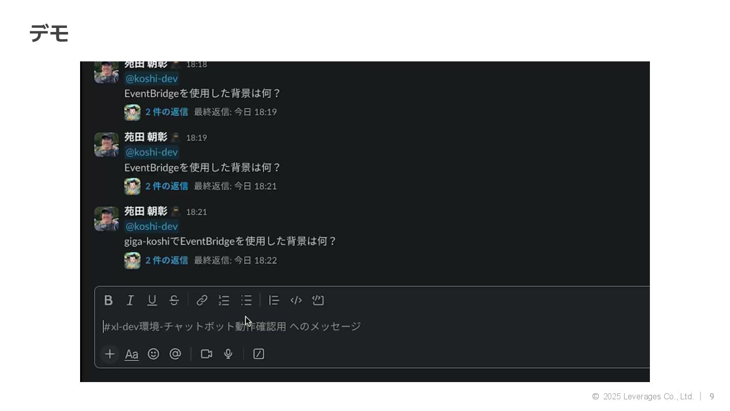 8 © 2025 Leverages Co., Ltd. 引き継ぎコンシェルジュ ko☆shiとは ko☆shiを導入することで、暗黙知の情報を自動で吸い上げ、前任者がいなくなった後も、 24時間いつでも対話できるようになります。