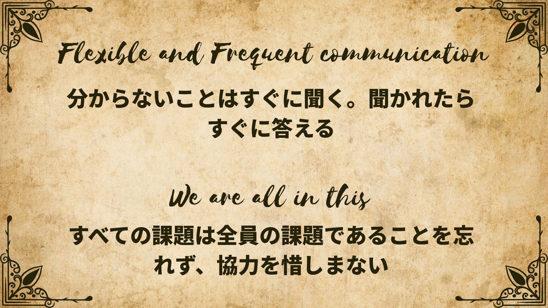 We are all in this すべての課題は全員の課題であることを忘 れず、協⼒を惜しまない 分からないことはすぐに聞く。聞かれたら すぐに答える Flexible