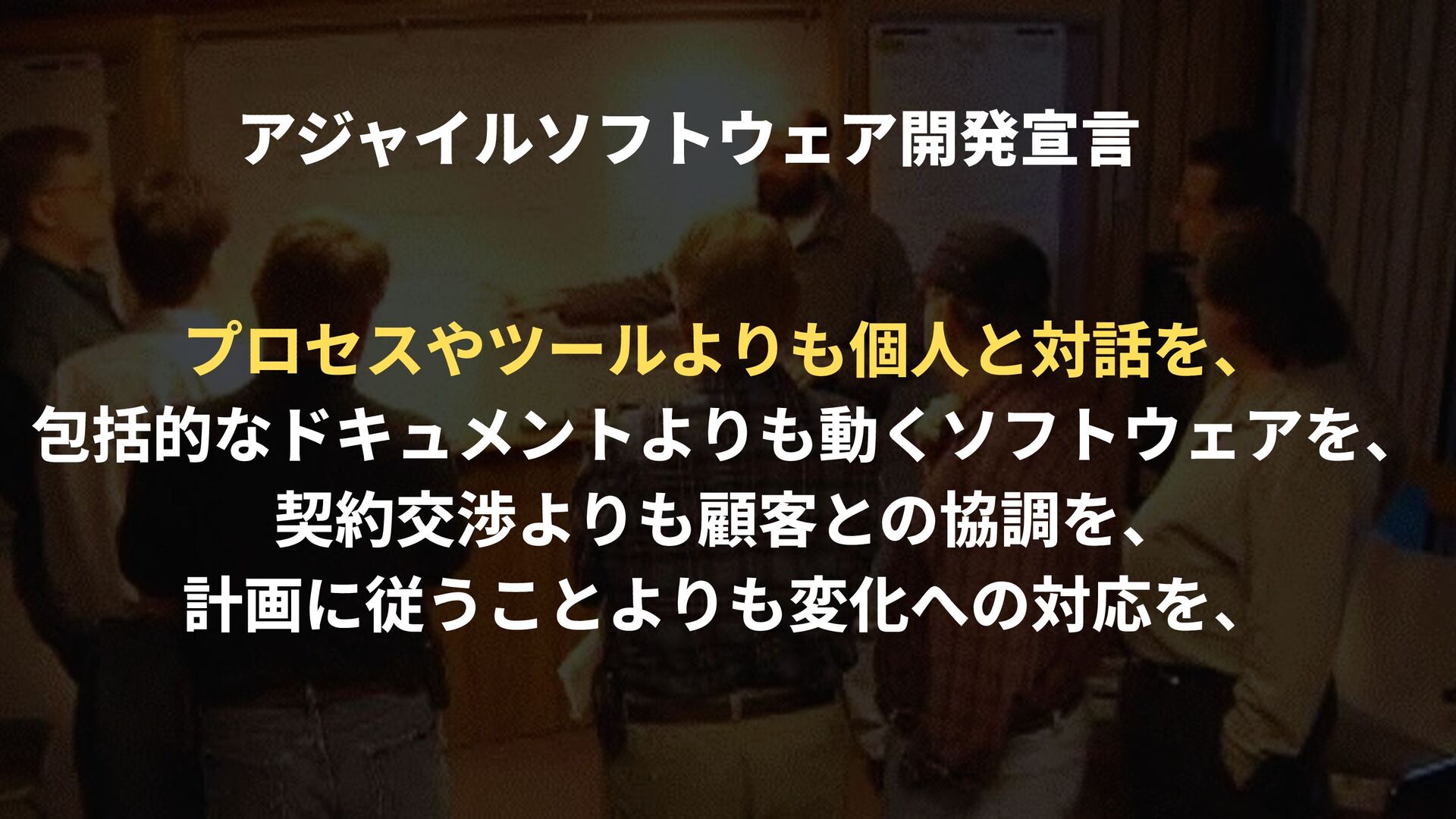 プロセスやツールよりも個⼈と対話を、 包括的なドキュメントよりも動くソフトウェアを、 契約交渉よりも顧客との協調を、 計画に従うことよりも変化への対応を、 アジャイルソフトウェア開発宣⾔
