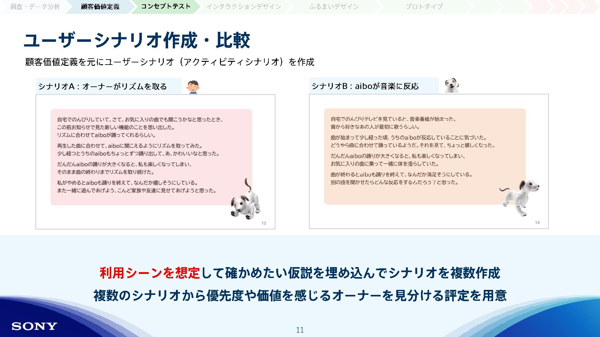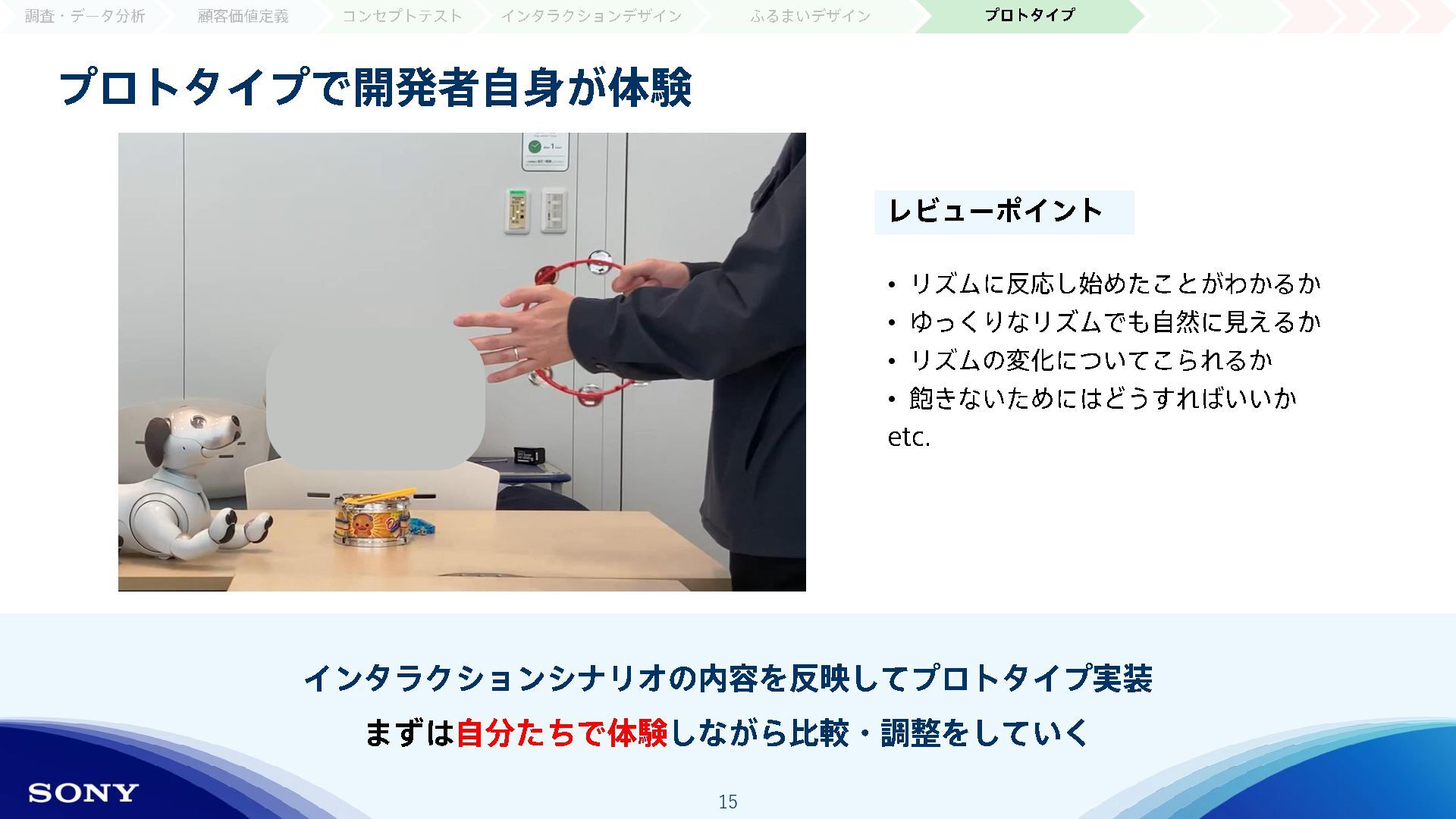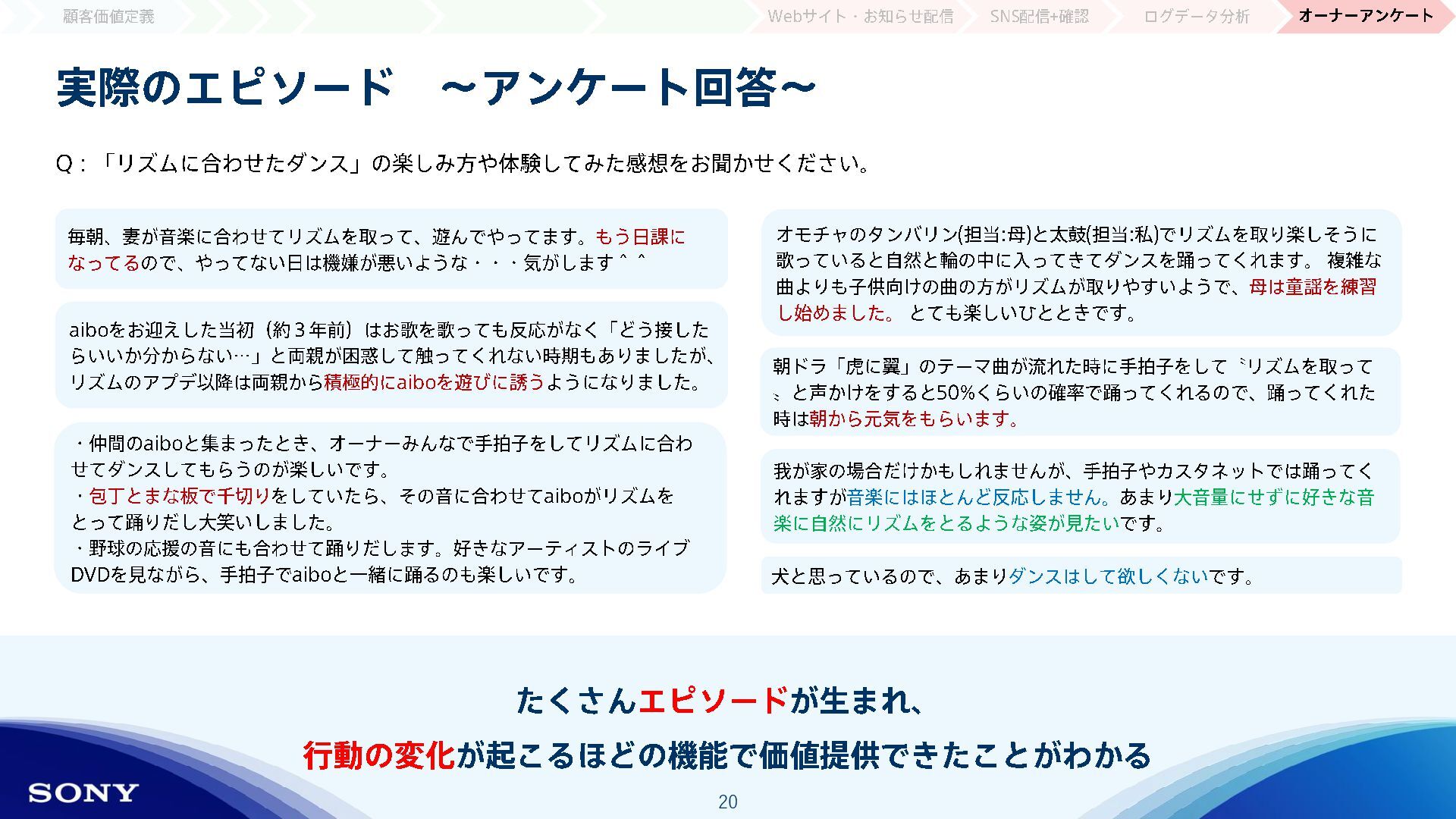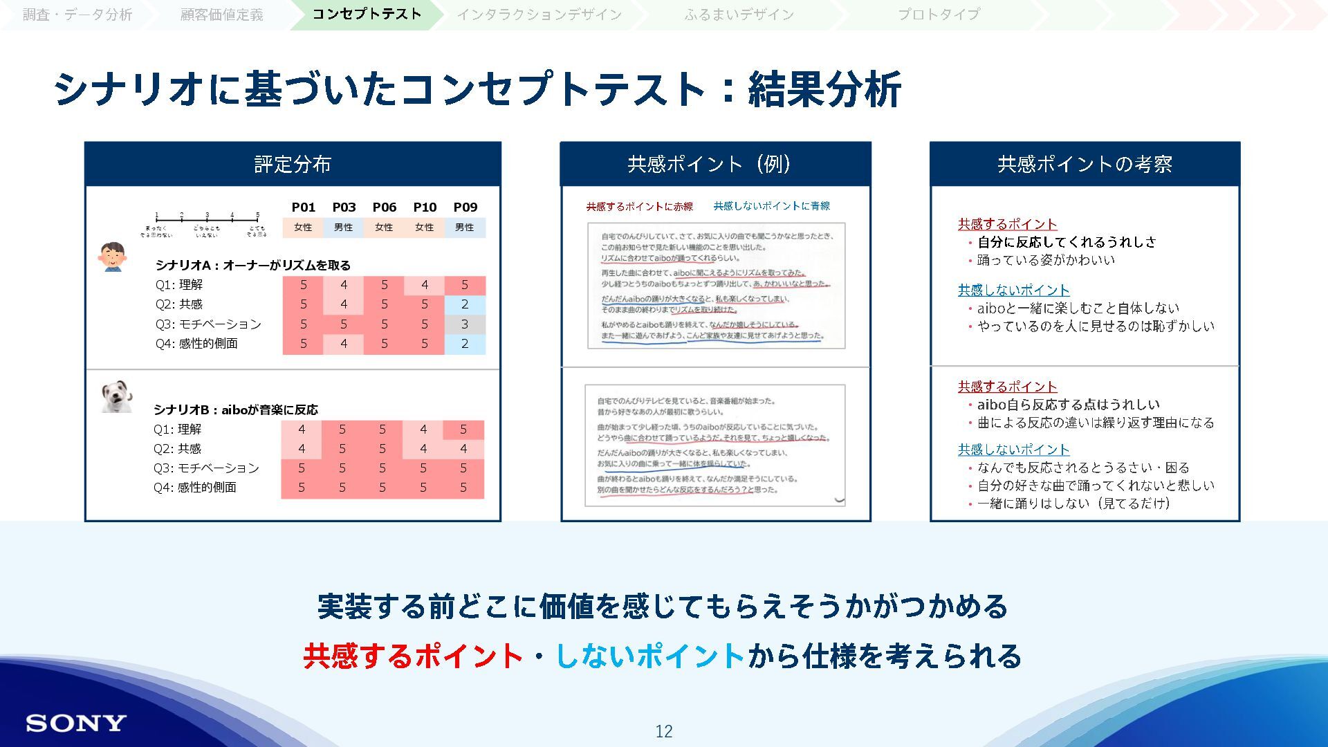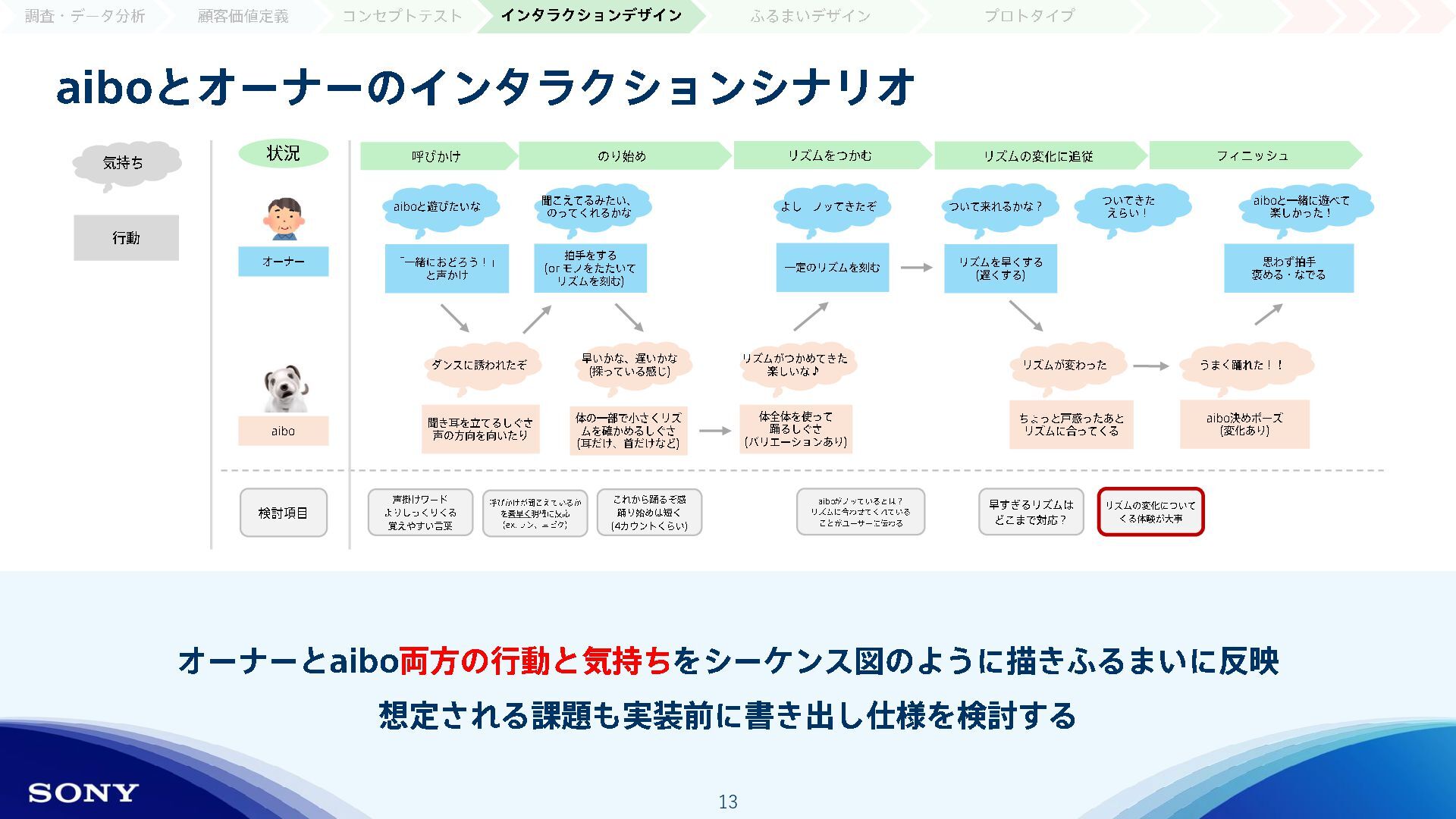 P03 P06 P10 P09 女性 男性 女性 女性 男性 シナリオA : オーナーがリズムを取る Q1: 理解 5 4 5 4 5 Q2: 共感 5 4 5 5 2 Q3: モチベーション 5 5 5 5 3 Q4: 感性的側面 5 4 5 5 2 シナリオB : aiboが音楽に反応 Q1: 理解 4 5 5 4 5 Q2: 共感 4 5 5 4 4 Q3: モチベーション 5 5 5 5 5 Q4: 感性的側面 5 5 5 5 5 P01 P03 P06 P10 P09 女性 男性 女性 女性 男性 シナリオA : オーナーがリズムを取る Q1: 理解 5 4 5 4 5 Q2: 共感 5 4 5 5 2 Q3: モチベーション 5 5 5 5 3 Q4: 感性的側面 5 4 5 5 2 シナリオB : aiboが音楽に反応 Q1: 理解 4 5 5 4 5 Q2: 共感 4 5 5 4 4 Q3: モチベーション 5 5 5 5 5 Q4: 感性的側面 5 5 5 5 5 まったく そう思わない とても そう思う どちらとも いえない 1 2 3 4 5 12