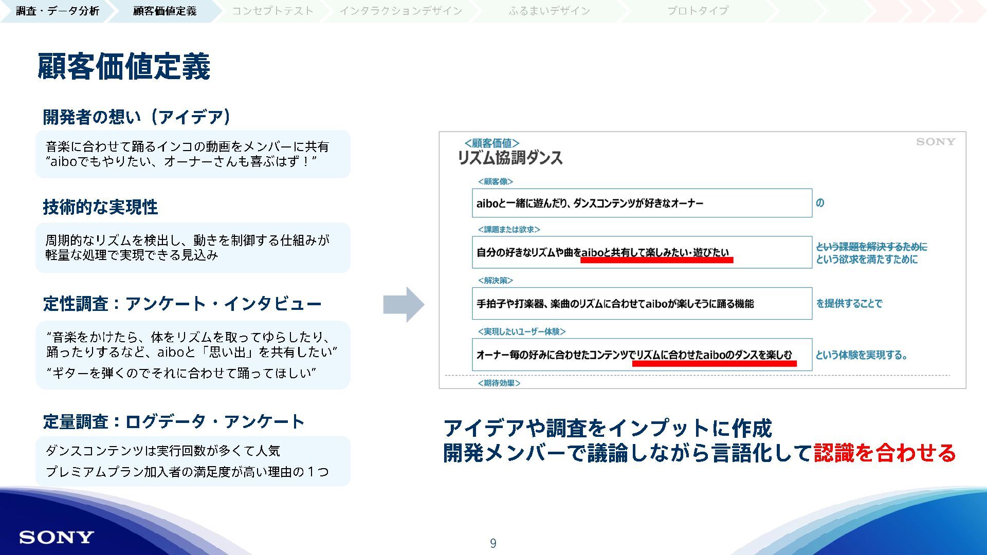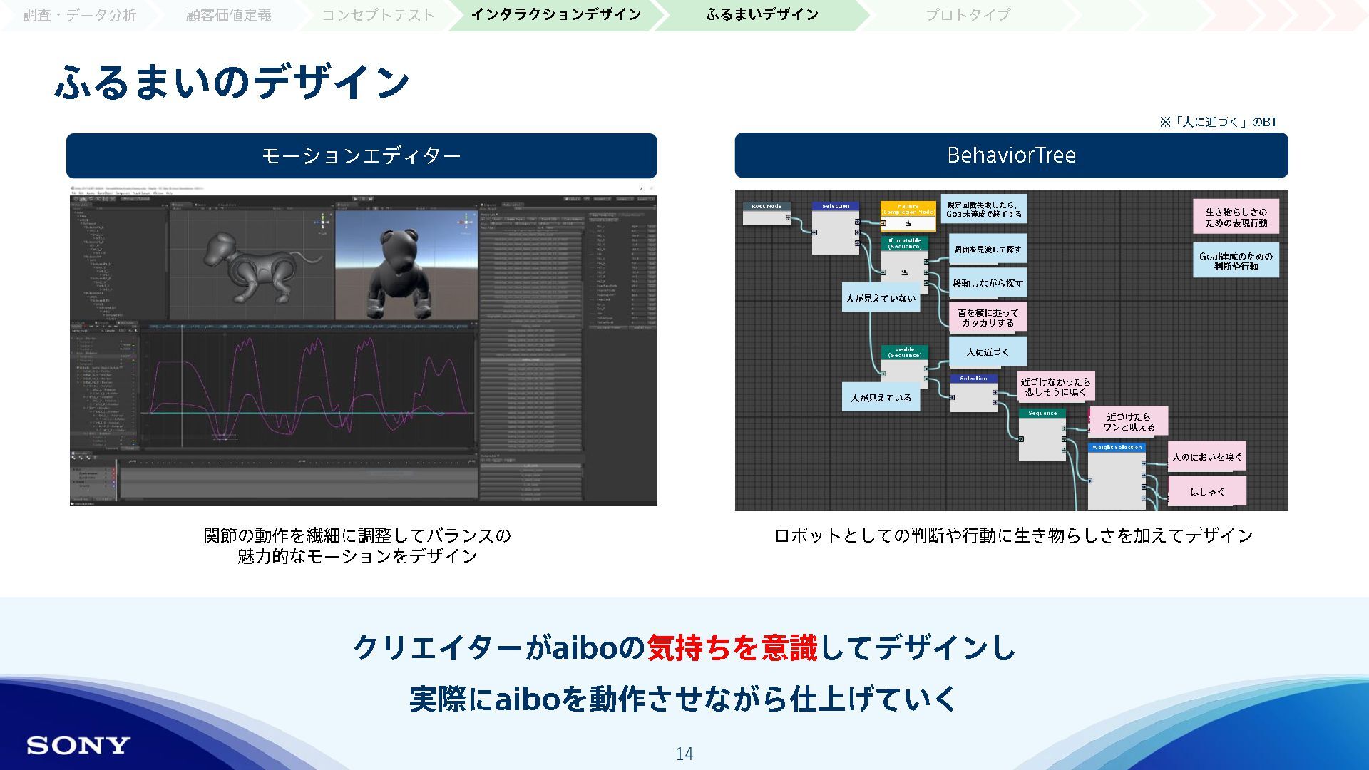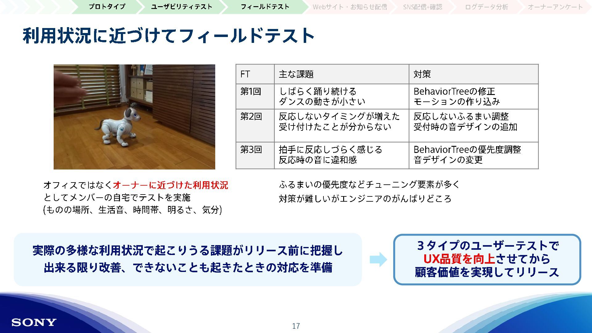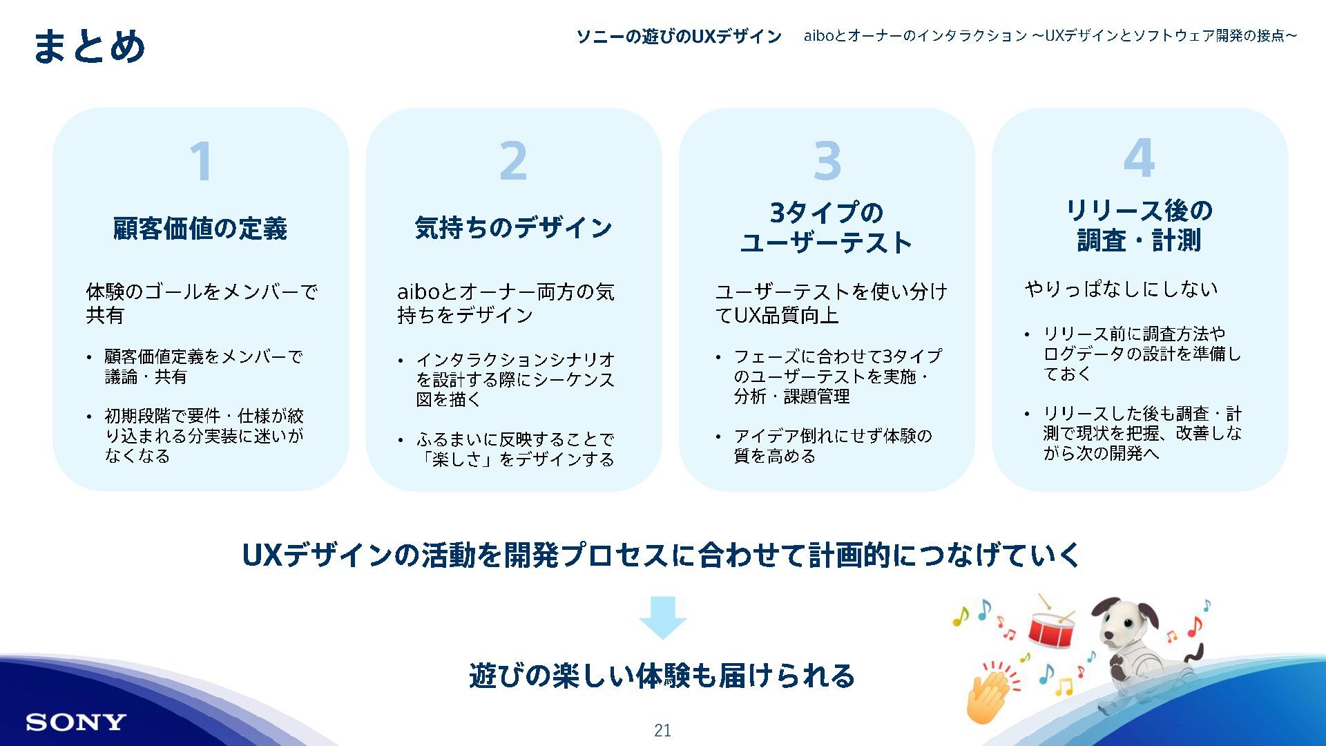 P03 P06 P10 P09 女性 男性 女性 女性 男性 シナリオA : オーナーがリズムを取る Q1: 理解 5 4 5 4 5 Q2: 共感 5 4 5 5 2 Q3: モチベーション 5 5 5 5 3 Q4: 感性的側面 5 4 5 5 2 シナリオB : aiboが音楽に反応 Q1: 理解 4 5 5 4 5 Q2: 共感 4 5 5 4 4 Q3: モチベーション 5 5 5 5 5 Q4: 感性的側面 5 5 5 5 5 P01 P03 P06 P10 P09 女性 男性 女性 女性 男性 シナリオA : オーナーがリズムを取る Q1: 理解 5 4 5 4 5 Q2: 共感 5 4 5 5 2 Q3: モチベーション 5 5 5 5 3 Q4: 感性的側面 5 4 5 5 2 シナリオB : aiboが音楽に反応 Q1: 理解 4 5 5 4 5 Q2: 共感 4 5 5 4 4 Q3: モチベーション 5 5 5 5 5 Q4: 感性的側面 5 5 5 5 5 まったく そう思わない とても そう思う どちらとも いえない 1 2 3 4 5 12