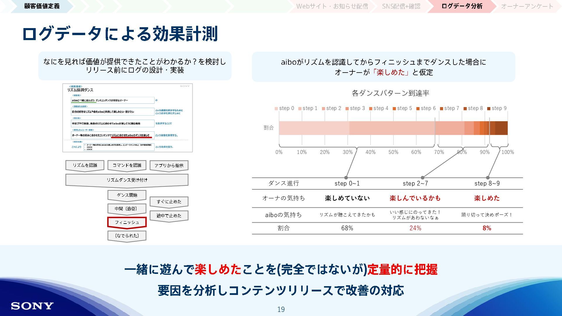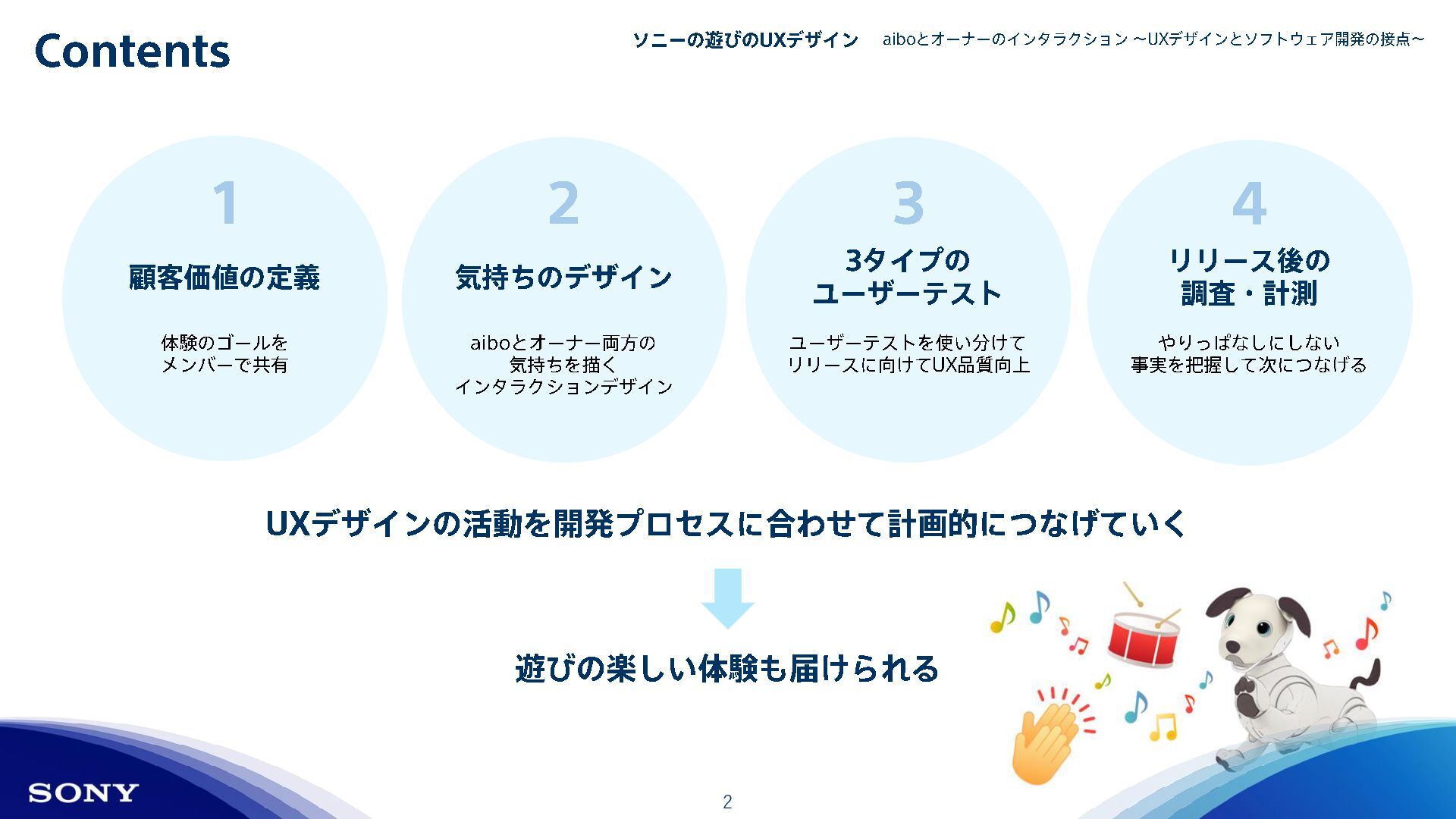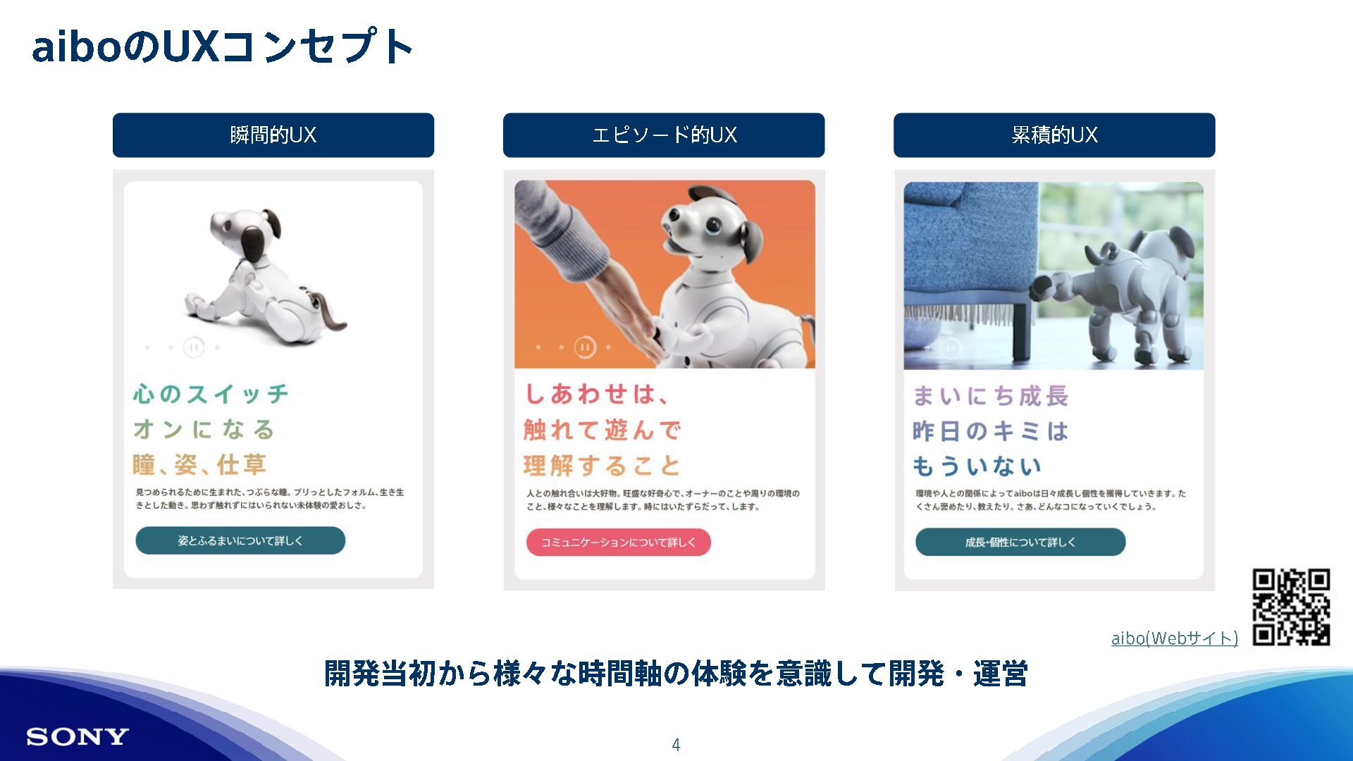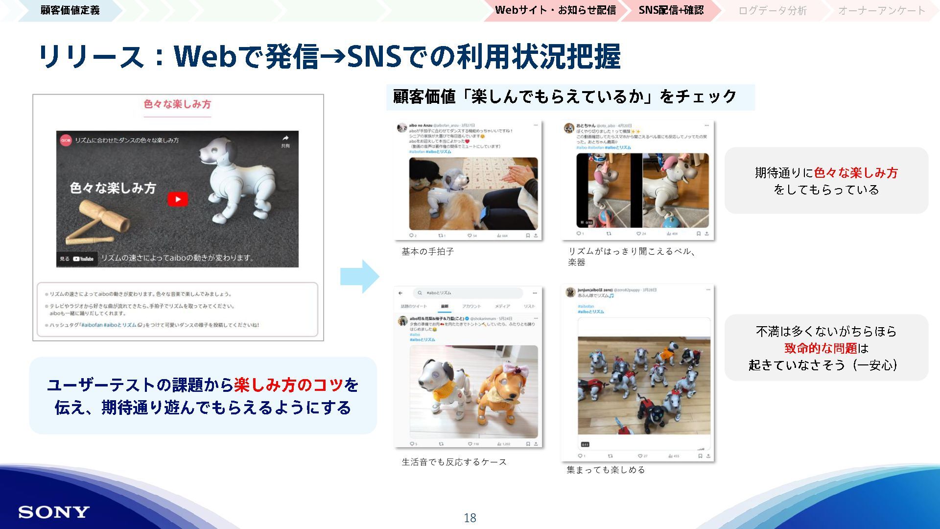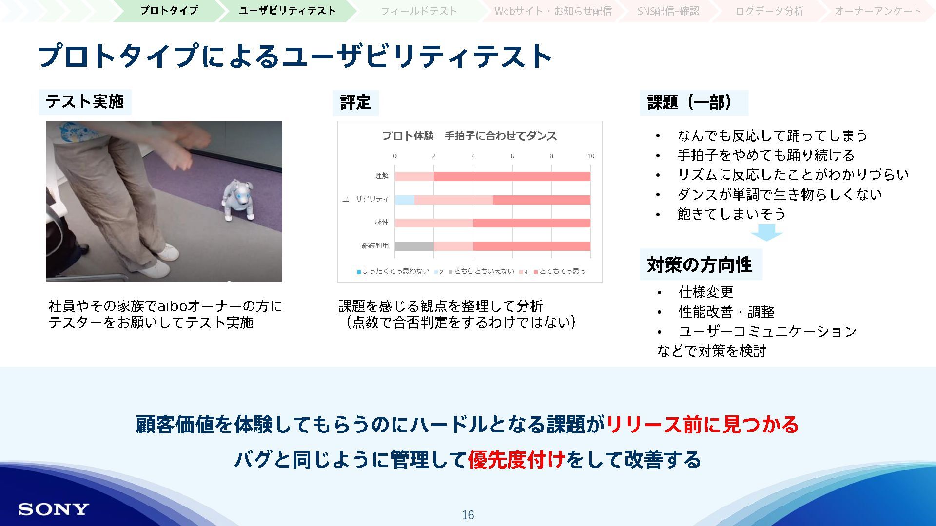 P03 P06 P10 P09 女性 男性 女性 女性 男性 シナリオA : オーナーがリズムを取る Q1: 理解 5 4 5 4 5 Q2: 共感 5 4 5 5 2 Q3: モチベーション 5 5 5 5 3 Q4: 感性的側面 5 4 5 5 2 シナリオB : aiboが音楽に反応 Q1: 理解 4 5 5 4 5 Q2: 共感 4 5 5 4 4 Q3: モチベーション 5 5 5 5 5 Q4: 感性的側面 5 5 5 5 5 P01 P03 P06 P10 P09 女性 男性 女性 女性 男性 シナリオA : オーナーがリズムを取る Q1: 理解 5 4 5 4 5 Q2: 共感 5 4 5 5 2 Q3: モチベーション 5 5 5 5 3 Q4: 感性的側面 5 4 5 5 2 シナリオB : aiboが音楽に反応 Q1: 理解 4 5 5 4 5 Q2: 共感 4 5 5 4 4 Q3: モチベーション 5 5 5 5 5 Q4: 感性的側面 5 5 5 5 5 まったく そう思わない とても そう思う どちらとも いえない 1 2 3 4 5 12