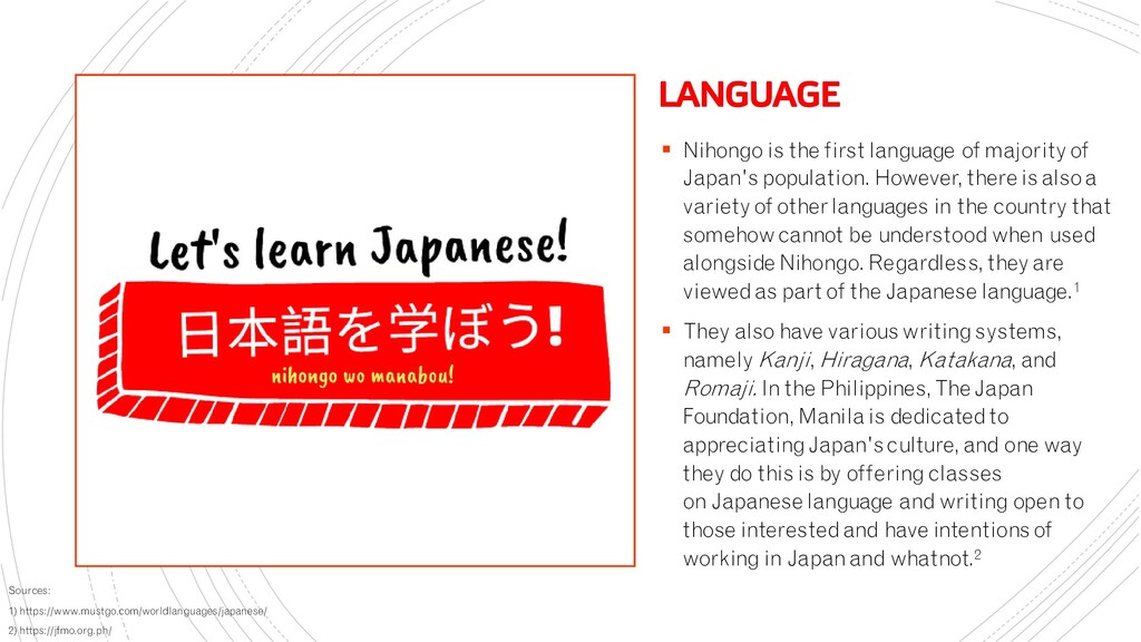 Japan's population. However, there is also a variety of other languages in the country that somehow cannot be understood when used alongside Nihongo. Regardless, they are viewed as part of the Japanese language.1 ▪ They also have various writing systems, namely Kanji, Hiragana, Katakana, and Romaji. In the Philippines,The Japan Foundation, Manila is dedicated to appreciating Japan's culture, and one way they do this is by offering classes on Japanese language and writing open to those interested and have intentions of working in Japan and whatnot.2 Sources: 1) https://www.mustgo.com/worldlanguages/japanese/ 2) https://jfmo.org.ph/