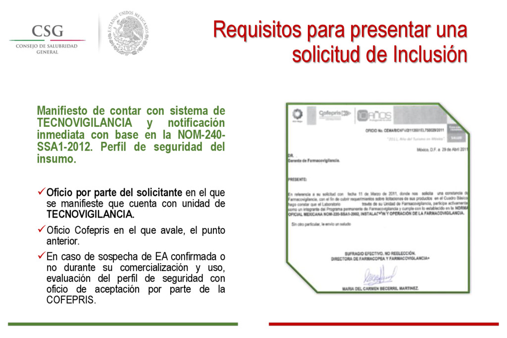 con base en la NOM-220- SSA1-2012. Perfil de seguridad del insumo. Oficio por parte del solicitante en el que se manifieste que cuenta con unidad de farmacovigilancia. Oficio Cofepris en el que avale, el punto anterior. En caso de sospecha de EA confirmada o no durante su comercialización y uso, evaluación del perfil de seguridad con oficio de aceptación por parte de la COFEPRIS. Requisitos para presentar una solicitud de Inclusión Puntos clave:*firma autógrafa