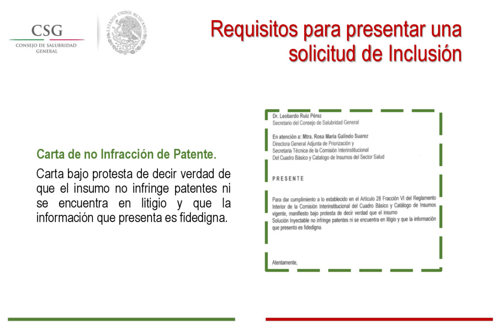 decir verdad de que el insumo no infringe patentes ni se encuentra en litigio y que la información que presenta es fidedigna. Requisitos para presentar una solicitud de Inclusión