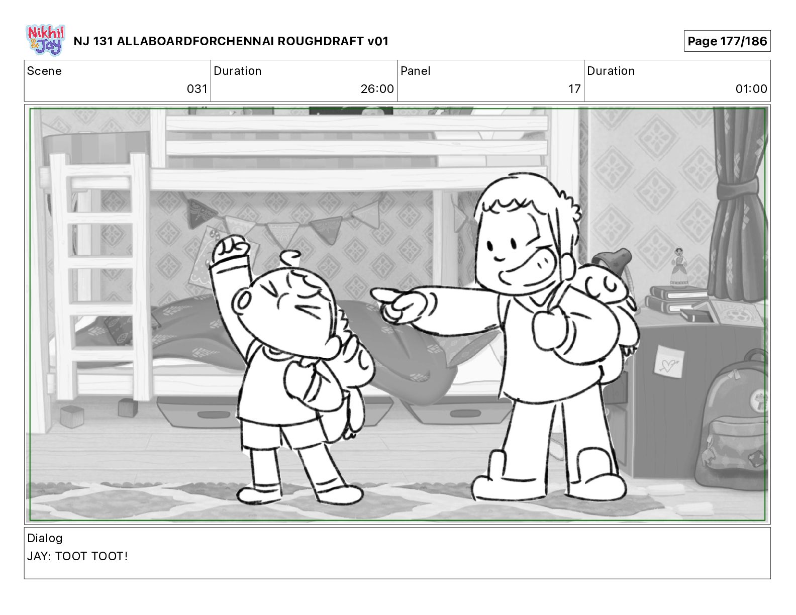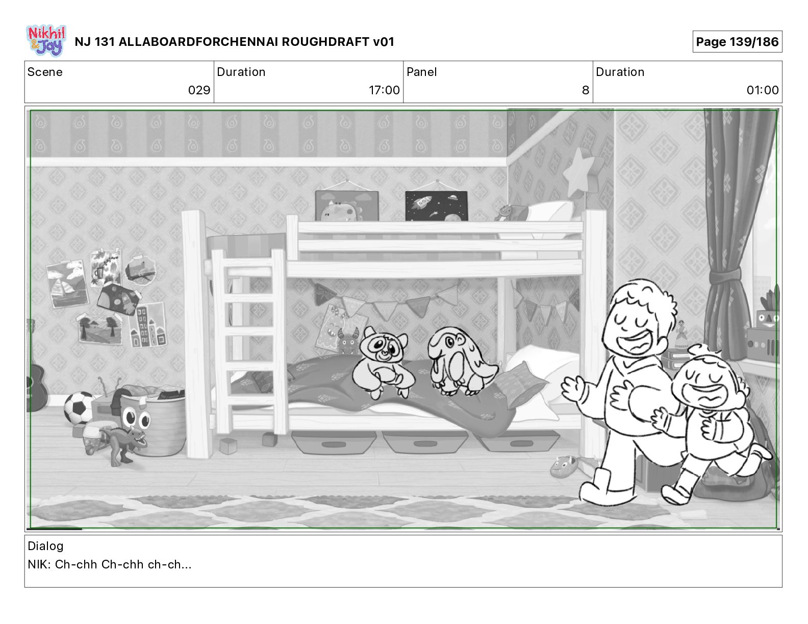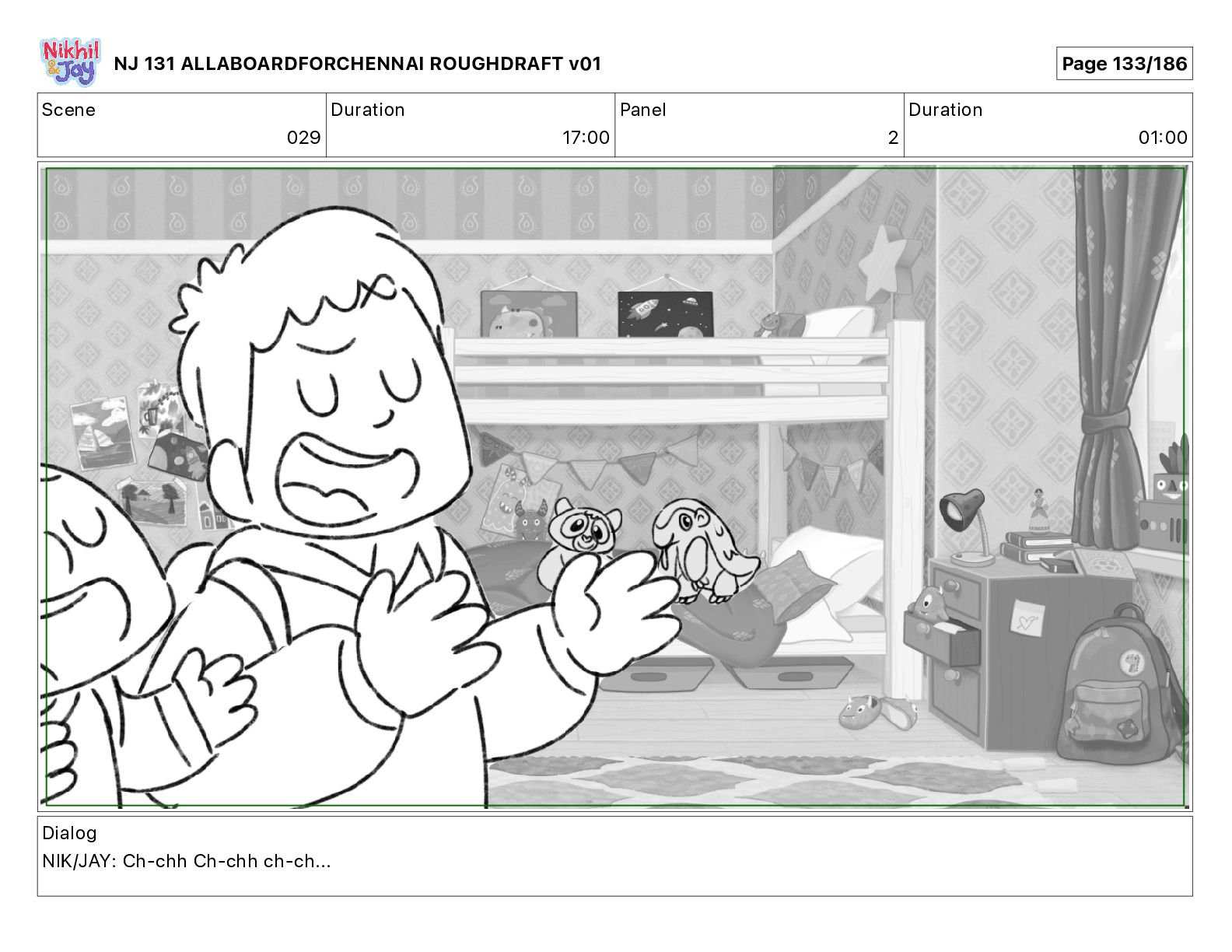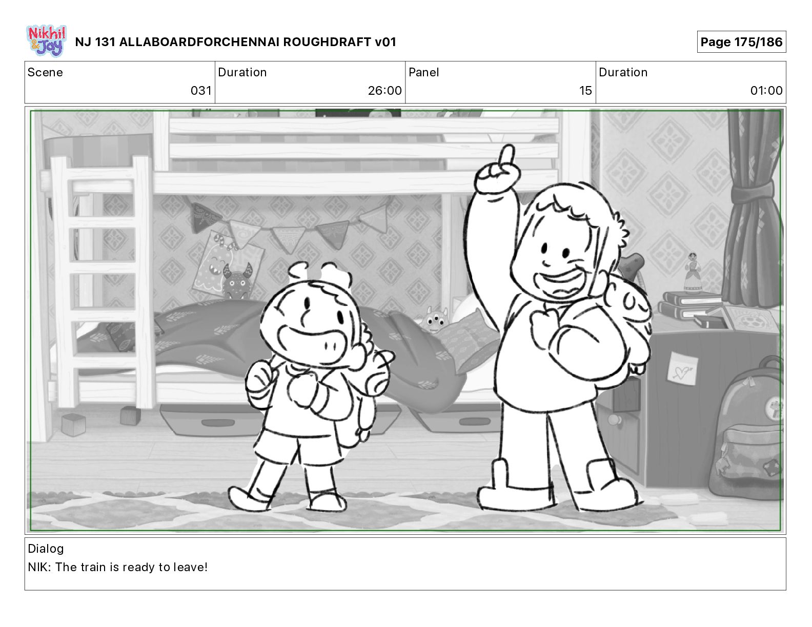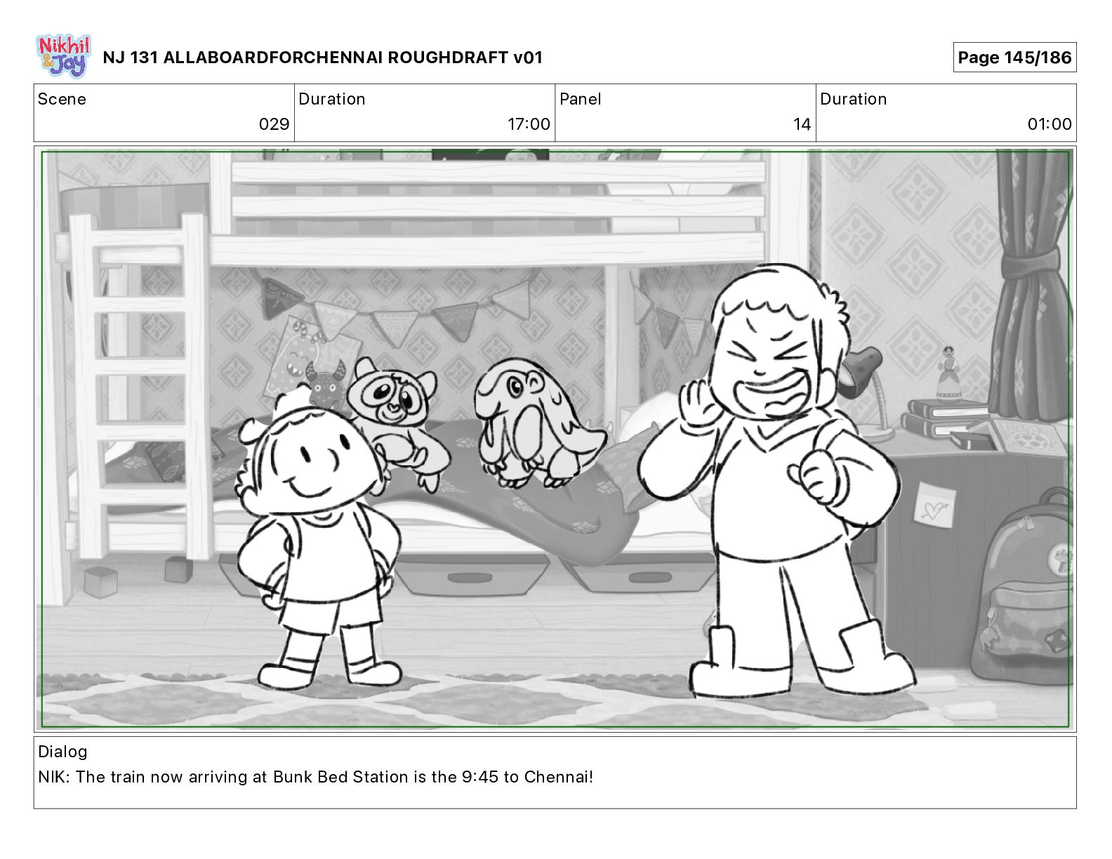 Dialog NIK: The train now arriving at Bunk Bed Station is the 9 45 to Chennai! NJ 131 ALLABOARDFORCHENNAI ROUGHDRAFT v01 Page 145/186