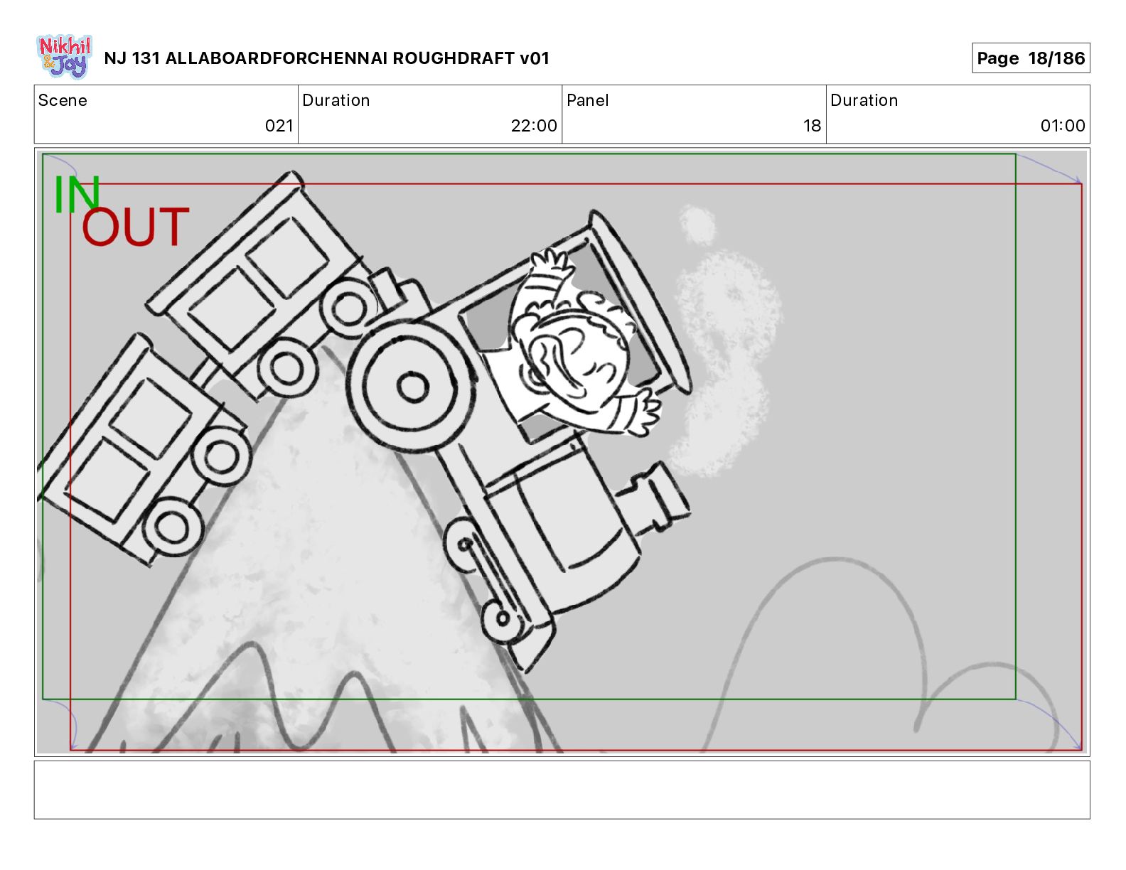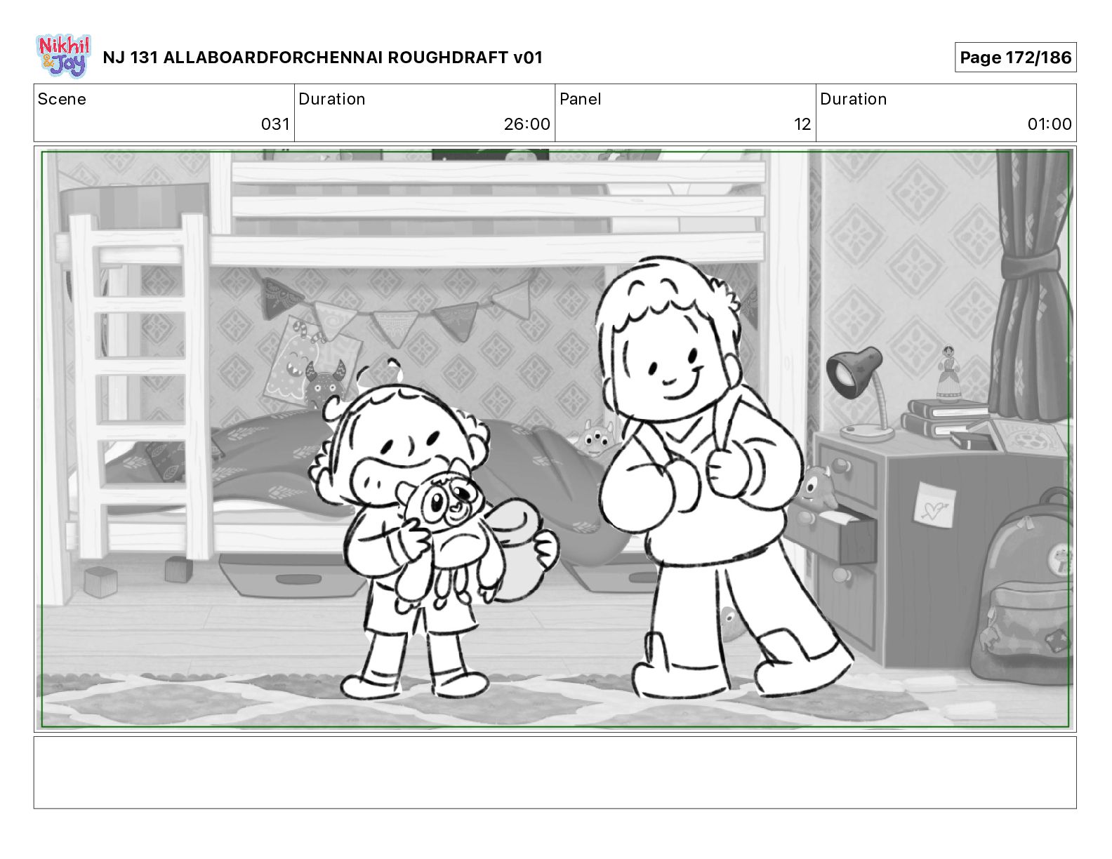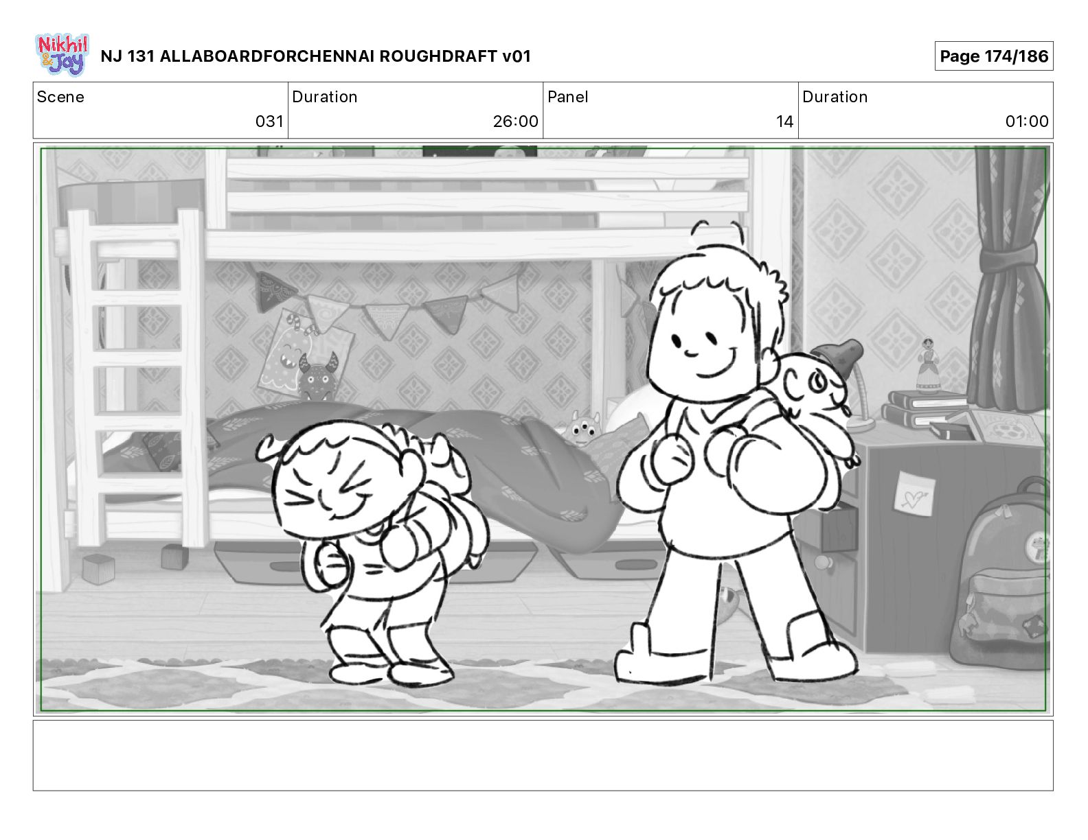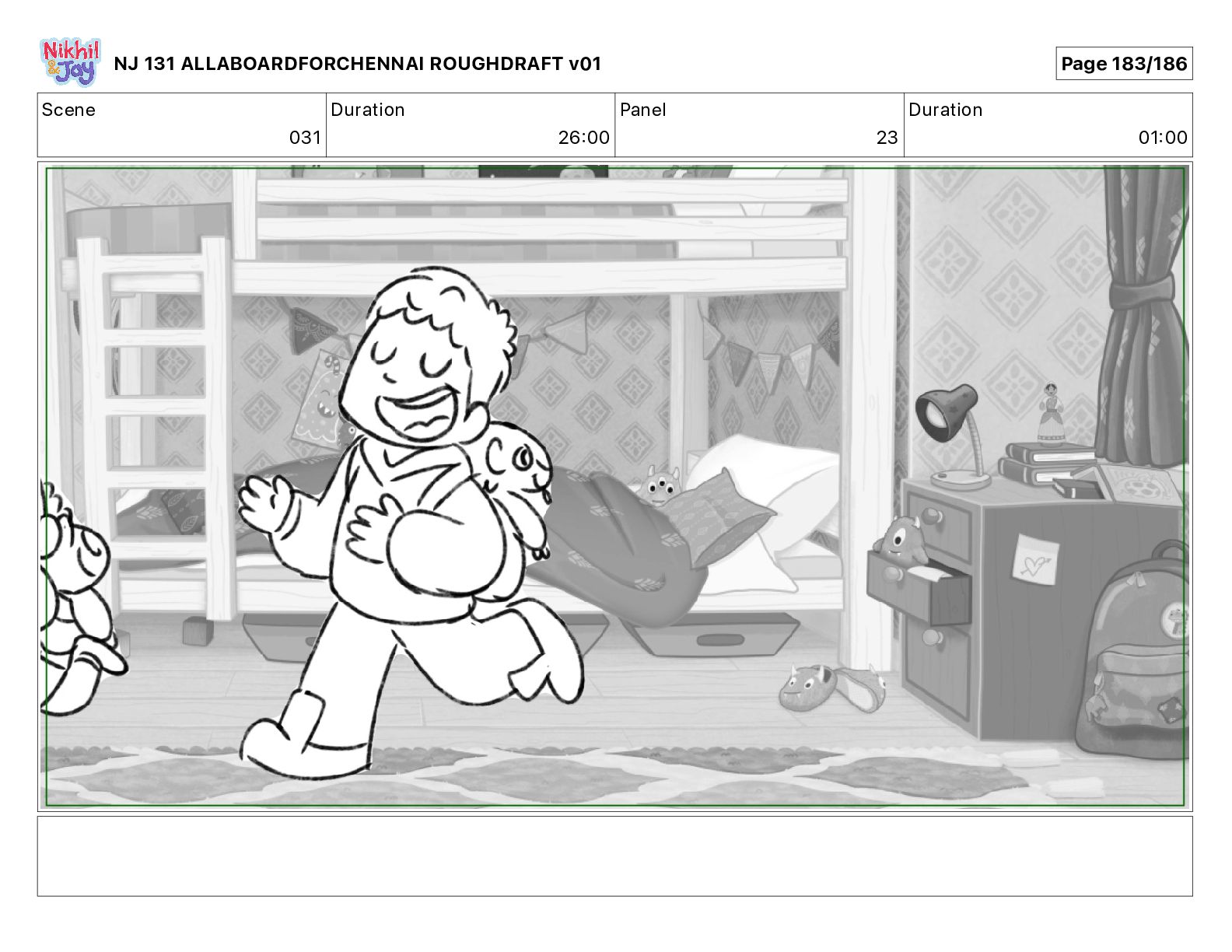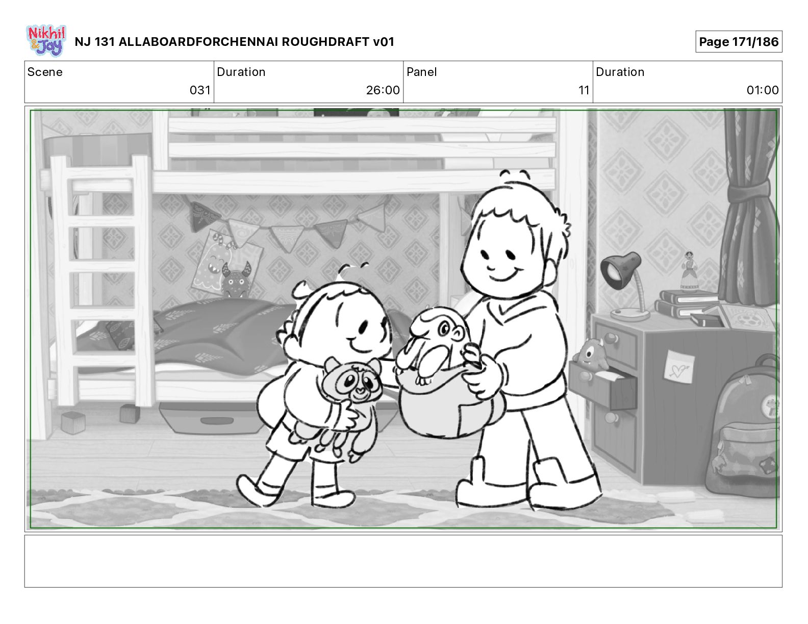 Dialog NIK: The train now arriving at Bunk Bed Station is the 9 45 to Chennai! NJ 131 ALLABOARDFORCHENNAI ROUGHDRAFT v01 Page 145/186