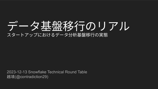 データ基盤移⾏のリアル スタートアップにおけるデータ分析基盤移⾏の実態 2023-12-13 Snowflake Technical Round Table 越境(@contradiction29)