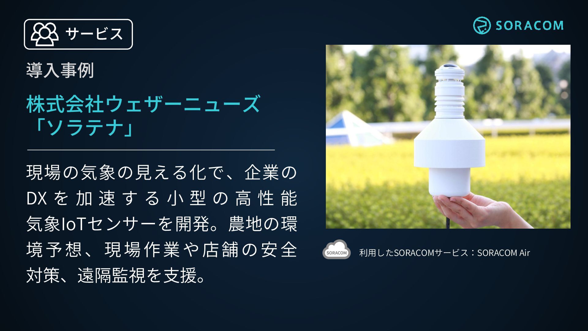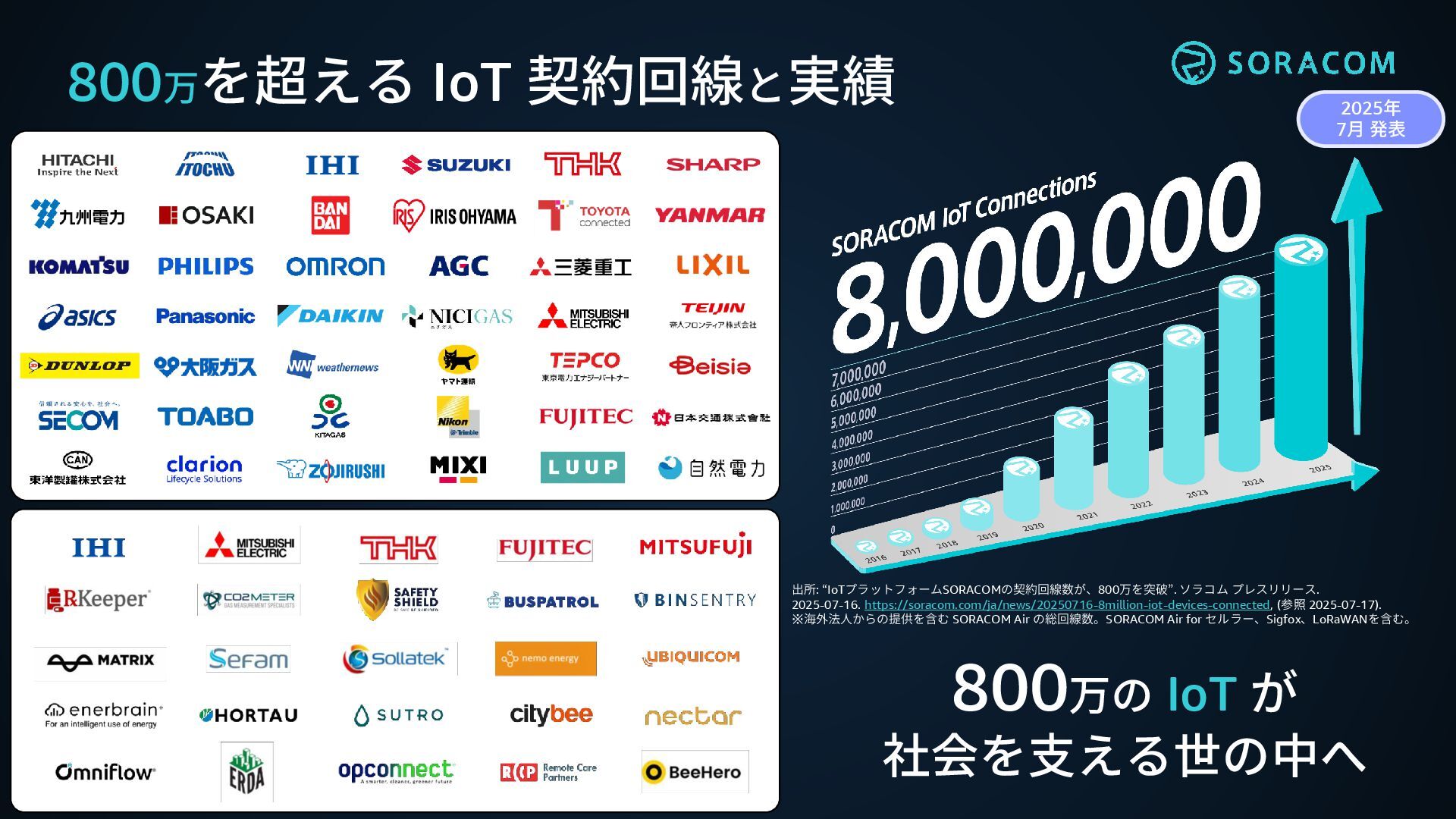 プレスリリース. 2025-07-16. https://soracom.com/ja/news/20250716-8million-iot-devices-connected, (参照 2025-07-17). ※海外法人からの提供を含む SORACOM Air の総回線数。SORACOM Air for セルラー、Sigfox、LoRaWANを含む。 2025年 7月 発表