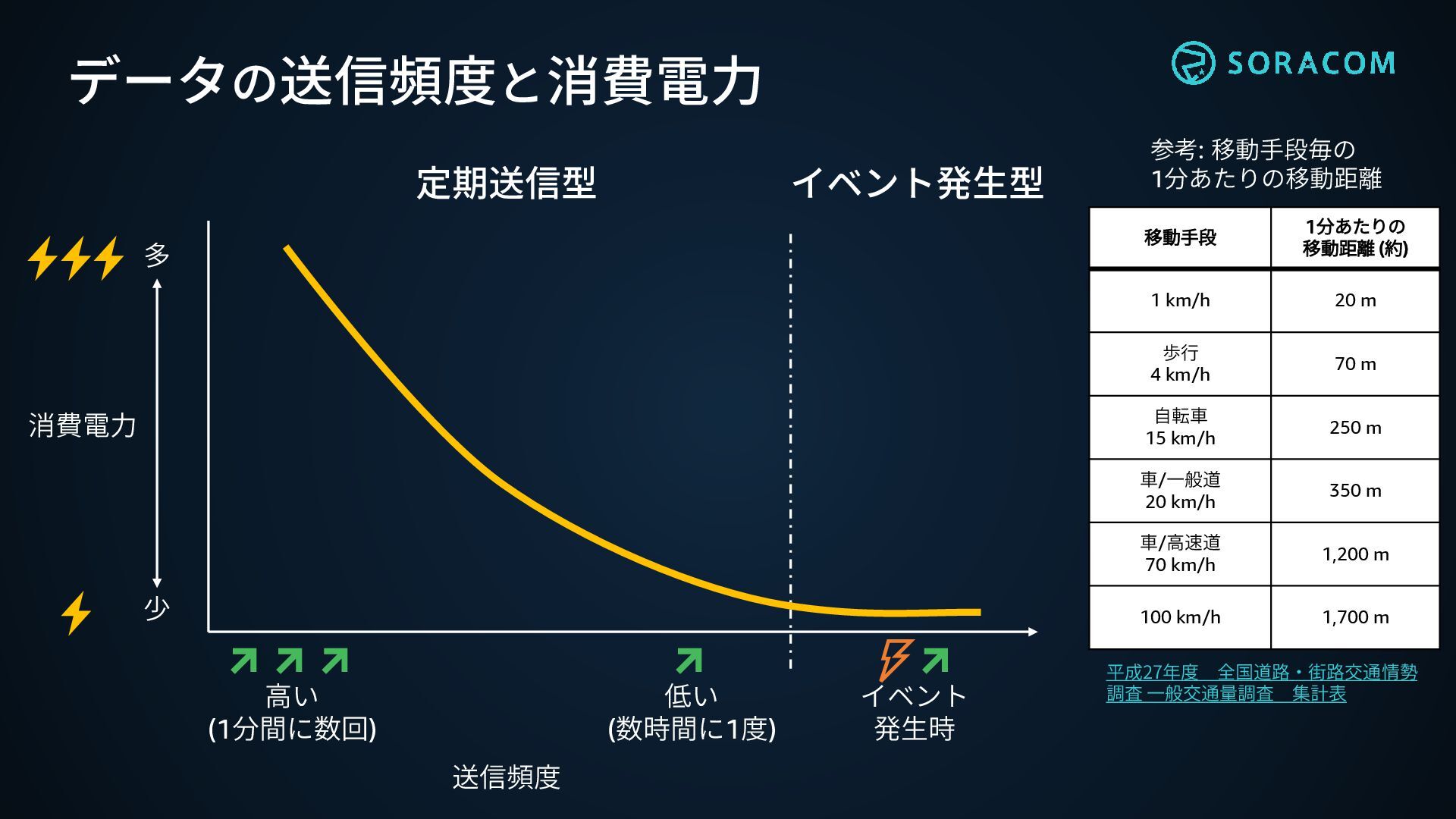 参考: 移動手段毎の 1分あたりの移動距離 移動手段 1分あたりの 移動距離 (約) 1 km/h 20 m 歩行 4 km/h 70 m 自転車 15 km/h 250 m 車/一般道 20 km/h 350 m 車/高速道 70 km/h 1,200 m 100 km/h 1,700 m 平成27年度 全国道路・街路交通情勢 調査 一般交通量調査 集計表 定期送信型 イベント 発生時