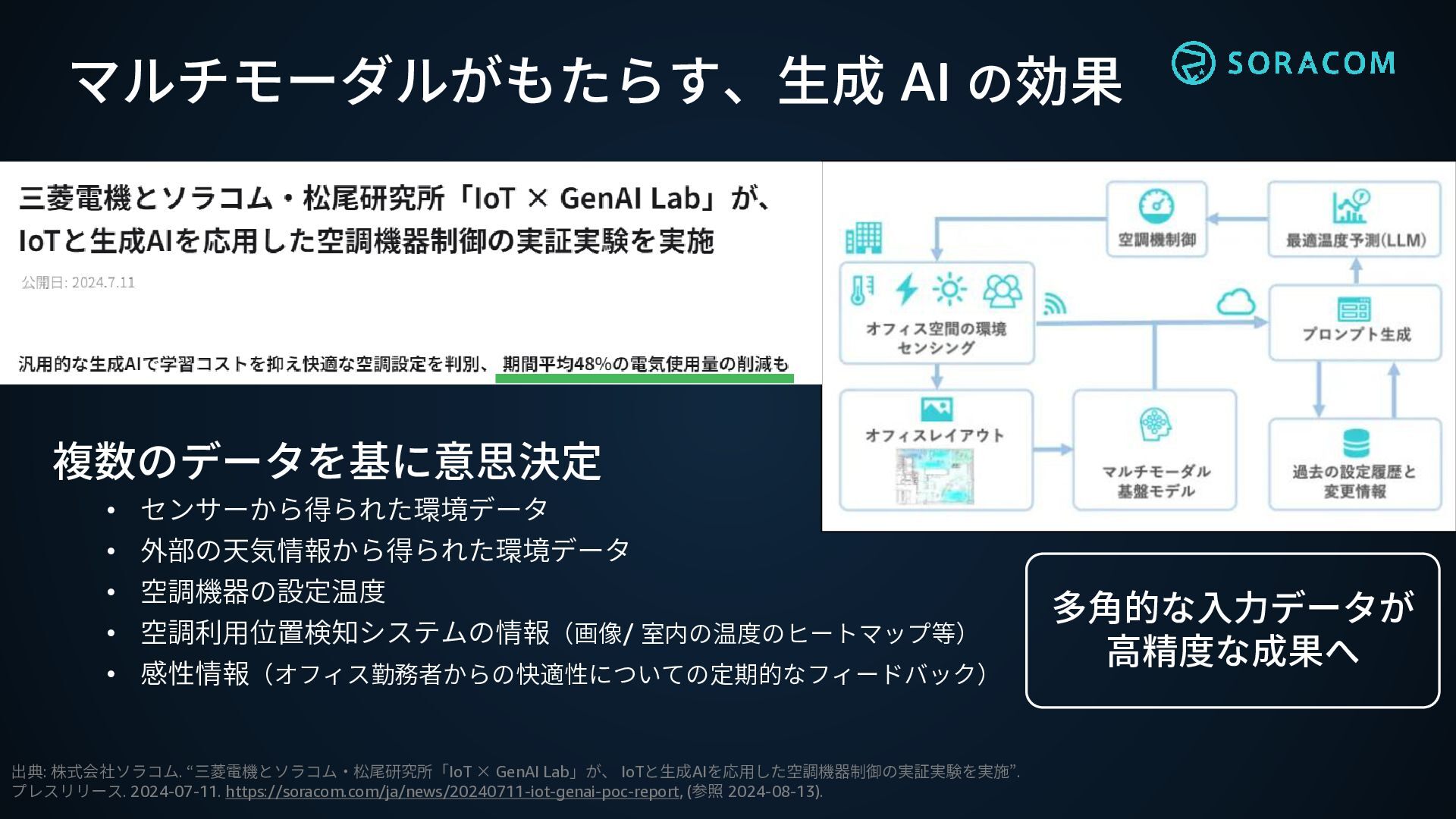 出典: 株式会社ソラコム. “三菱電機とソラコム・松尾研究所「IoT × GenAI Lab」が、 IoTと生成AIを応用した空調機器制御の実証実験を実施”. プレスリリース. 2024-07-11. https://soracom.com/ja/news/20240711-iot-genai-poc-report,