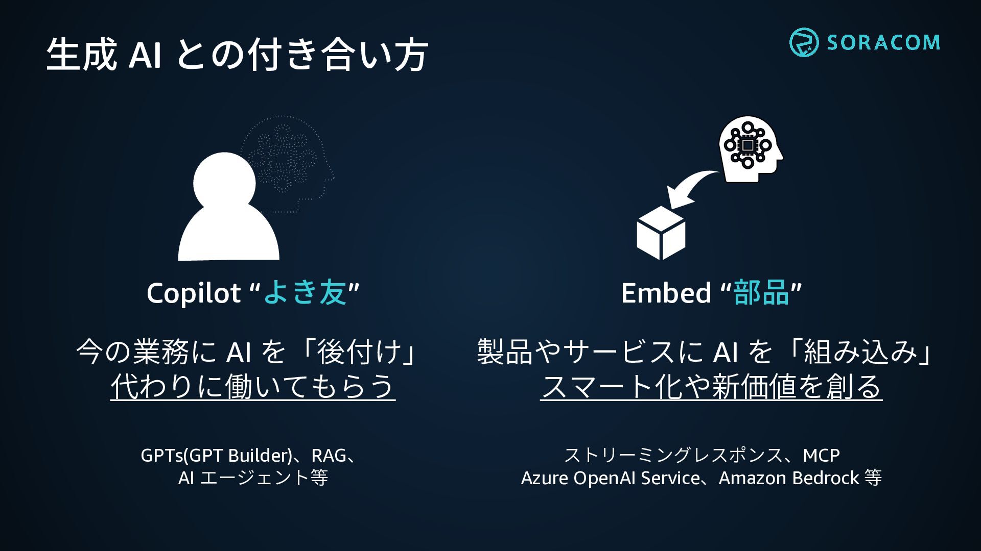 Azure OpenAI Service、Amazon Bedrock 等 今の業務に AI を「後付け」 代わりに働いてもらう Embed “部品” 製品やサービスに AI を「組み込み」 スマート化や新価値を創る