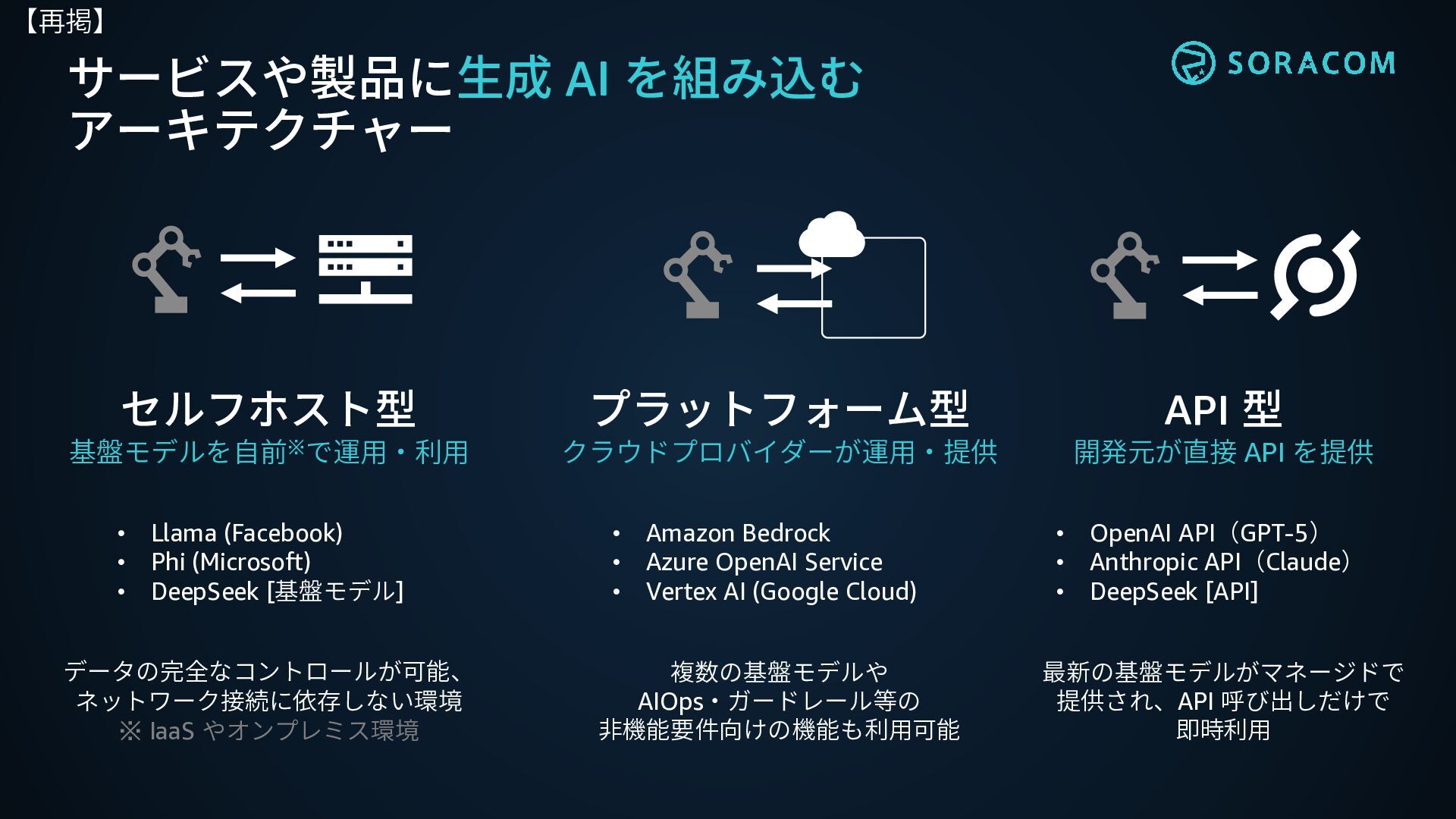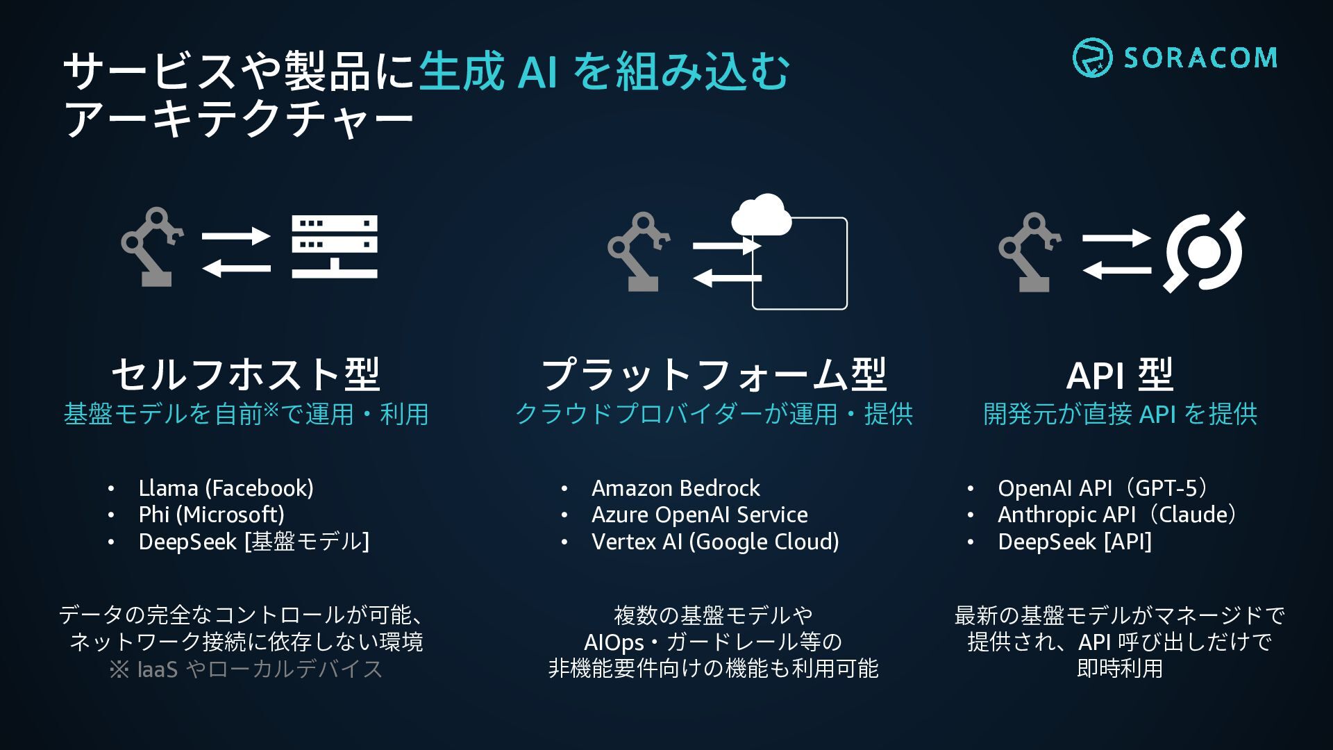AI 時代のハードウェア戦略とリアルワールド AI への道 プラットフォーム型 クラウドプロバイダーが運用・提供 セルフホスト型 基盤モデルを自前※で運用・利用 API 型