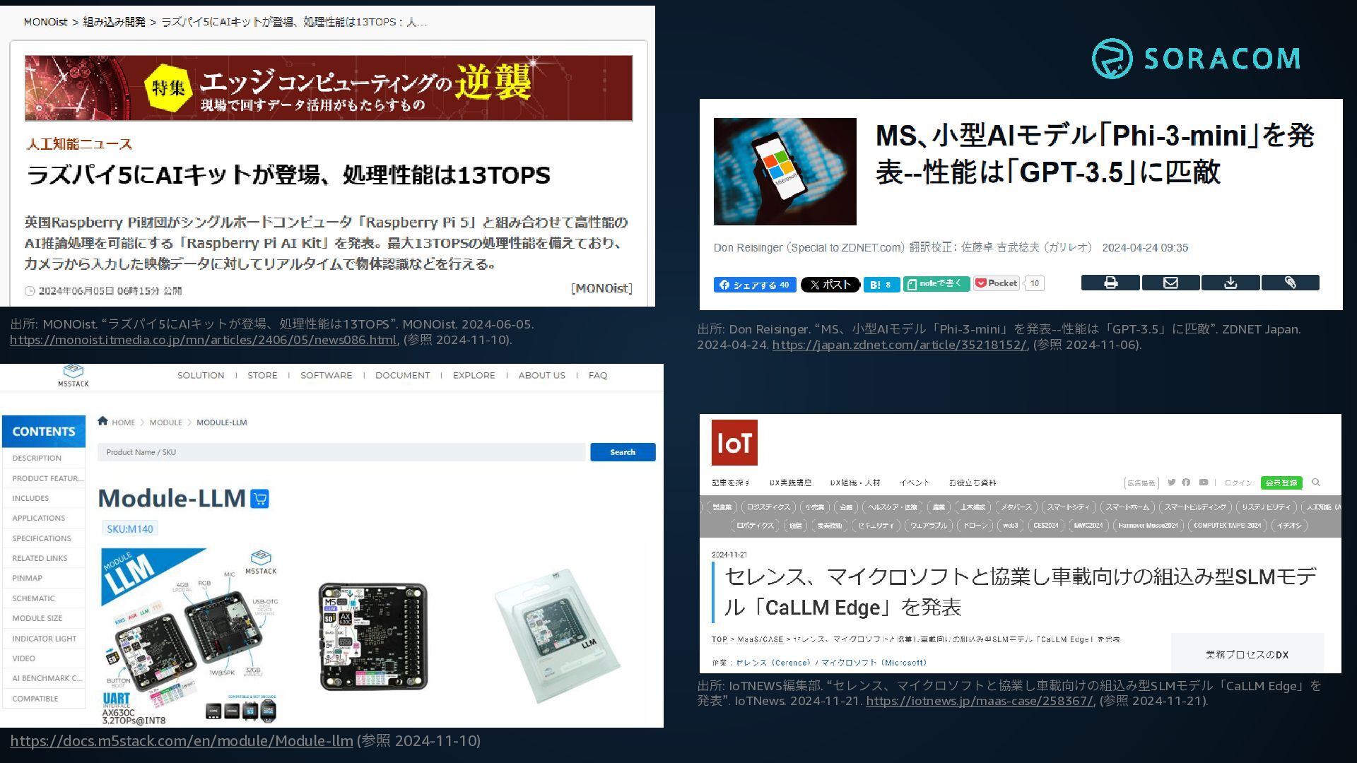 https://japan.zdnet.com/article/35218152/, (参照 2024-11-06). 出所: IoTNEWS編集部. “セレンス、マイクロソフトと協業し車載向けの組込み型SLMモデル「CaLLM Edge」を 発表”. IoTNews. 2024-11-21. https://iotnews.jp/maas-case/258367/, (参照 2024-11-21). 出所: MONOist. “ラズパイ5にAIキットが登場、処理性能は13TOPS”. MONOist. 2024-06-05. https://monoist.itmedia.co.jp/mn/articles/2406/05/news086.html, (参照 2024-11-10).