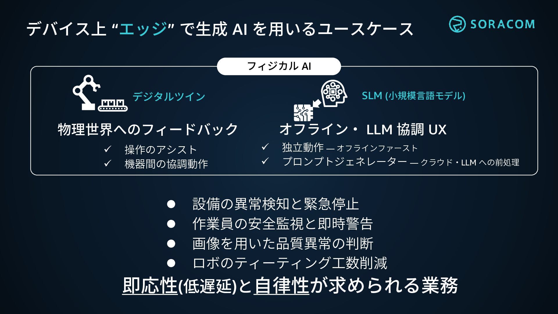 画像を用いた品質異常の判断 ⚫ ロボのティーティング工数削減 即応性(低遅延)と自律性が求められる業務 ✓ 独立動作 ― オフラインファースト ✓ プロンプトジェネレーター ― クラウド・LLM への前処理 オフライン・ LLM 協調 UX 物理世界へのフィードバック ✓ 操作のアシスト ✓ 機器間の協調動作 デジタルツイン SLM (小規模言語モデル) フィジカル AI