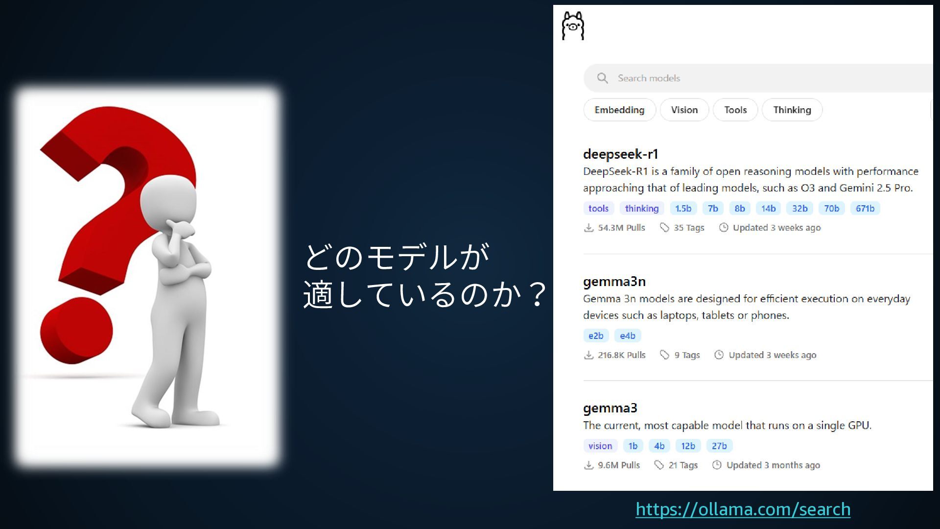 https://ollama.com/search どのモデルが 適しているのか?