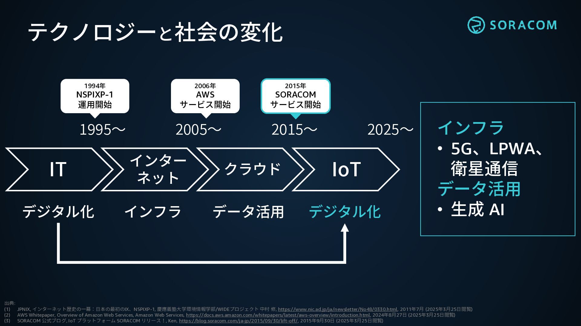 • 5G、LPWA、 衛星通信 データ活用 • 生成 AI IT インター ネット クラウド IoT 1994年 NSPIXP-1 運用開始 2006年 AWS サービス開始 2015年 SORACOM サービス開始 出典: (1) JPNIX, インターネット歴史の一幕:日本の最初のIX、NSPIXP-1, 慶應義塾大学環境情報学部/WIDEプロジェクト 中村 修, https://www.nic.ad.jp/ja/newsletter/No48/0330.html, 2011年7月 (2025年3月25日閲覧) (2) AWS Whitepaper, Overview of Amazon Web Services, Amazon Web Services, https://docs.aws.amazon.com/whitepapers/latest/aws-overview/introduction.html, 2024年8月27日 (2025年3月25日閲覧) (3) SORACOM 公式ブログ, IoT プラットフォーム SORACOM リリース!, Ken, https://blog.soracom.com/ja-jp/2015/09/30/lift-off/, 2015年9月30日 (2025年3月25日閲覧)