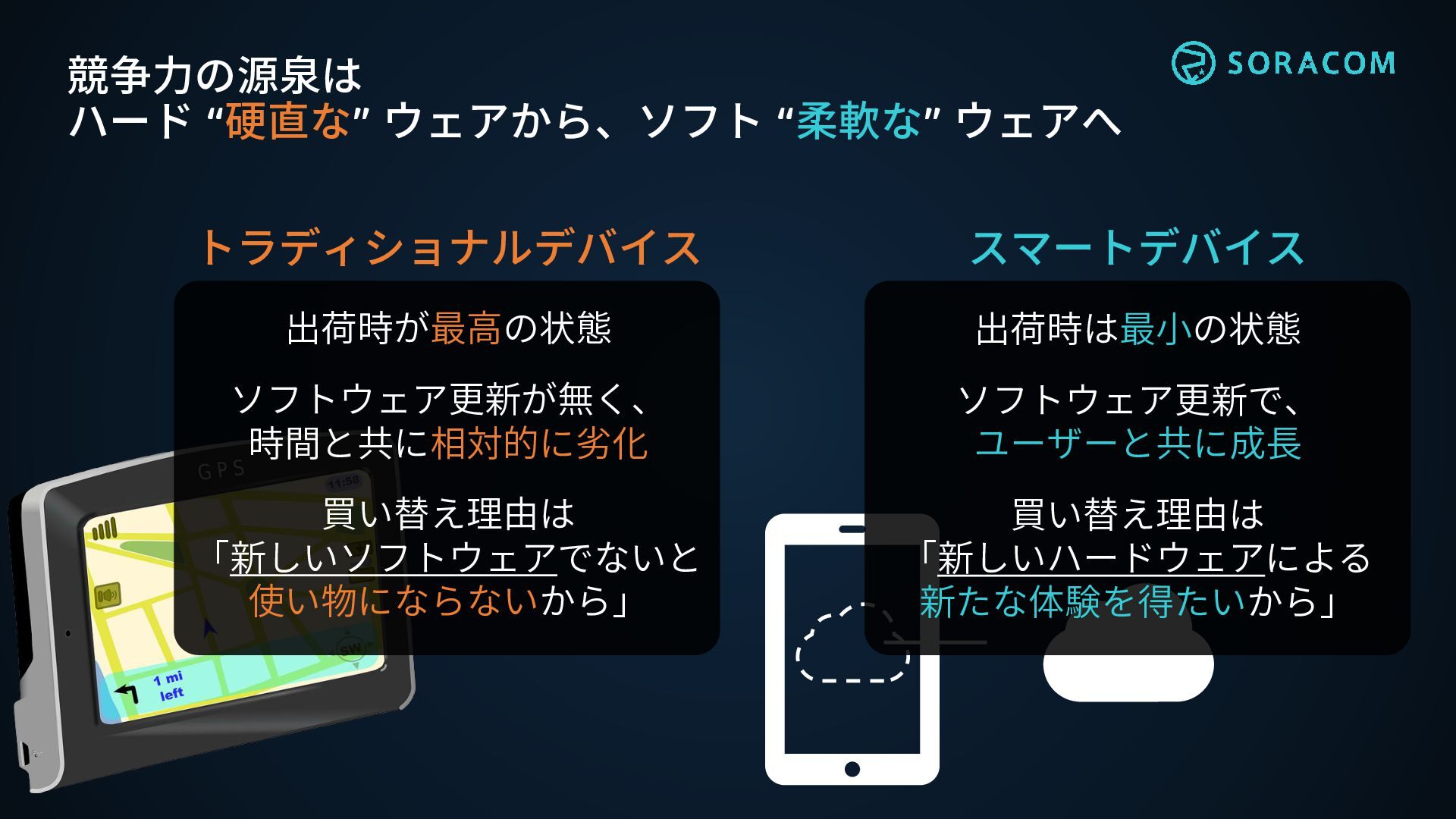 「新しいソフトウェアでないと 使い物にならないから」 出荷時は最小の状態 ソフトウェア更新で、 ユーザーと共に成長 買い替え理由は 「新しいハードウェアによる 新たな体験を得たいから」 トラディショナルデバイス スマートデバイス