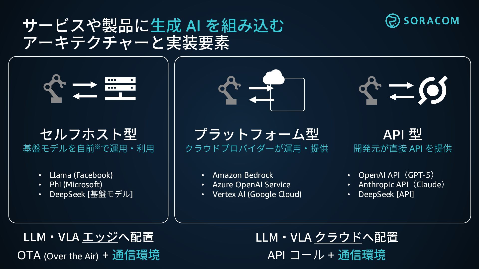 Service • Vertex AI (Google Cloud) • Llama (Facebook) • Phi (Microsoft) • DeepSeek [基盤モデル] プラットフォーム型 クラウドプロバイダーが運用・提供 セルフホスト型 基盤モデルを自前※で運用・利用 API 型 開発元が直接 API を提供 • OpenAI API(GPT-5) • Anthropic API(Claude) • DeepSeek [API] LLM・VLA エッジへ配置 OTA (Over the Air) + 通信環境 LLM・VLA クラウドへ配置 API コール + 通信環境