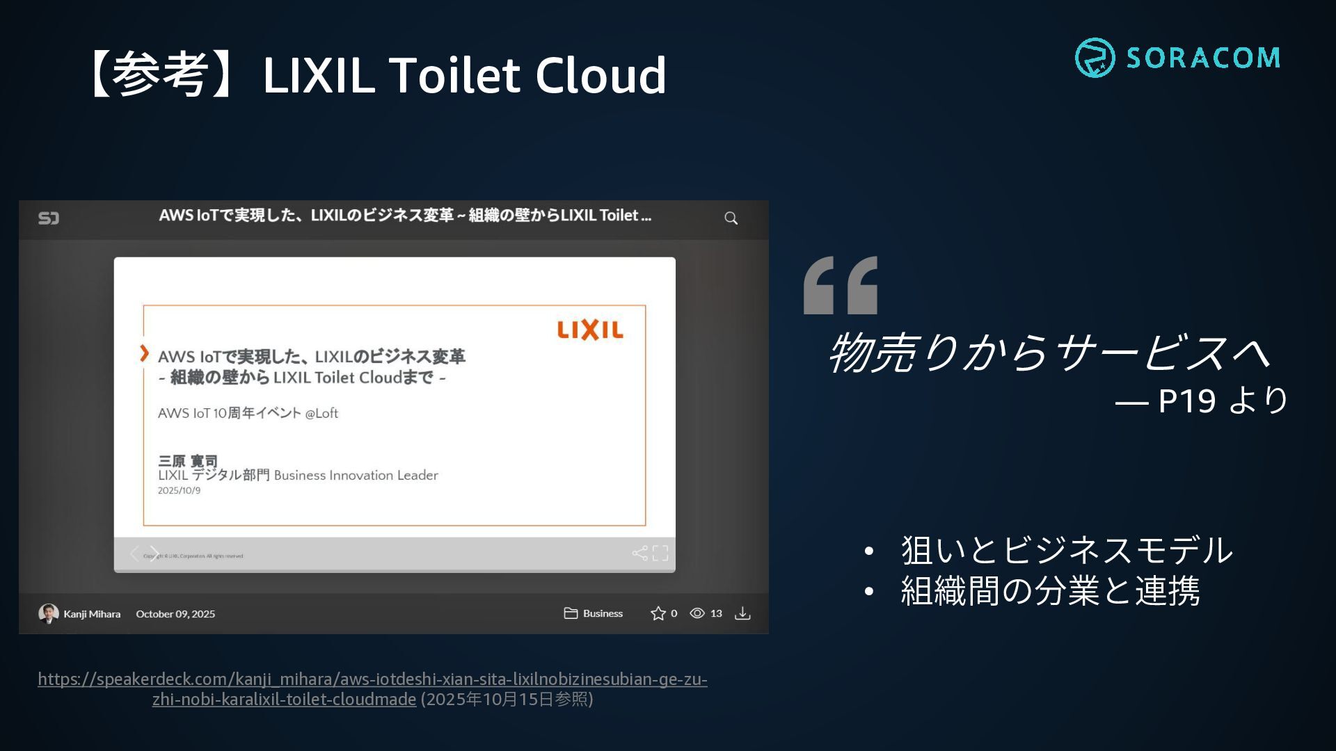【参考】LIXIL Toilet Cloud https://speakerdeck.com/kanji_mihara/aws-iotdeshi-xian-sita-lixilnobizinesubian-ge-zu- zhi-nobi-karalixil-toilet-cloudmade (2025年10月15日参照) 物売りからサービスへ ― P19 より