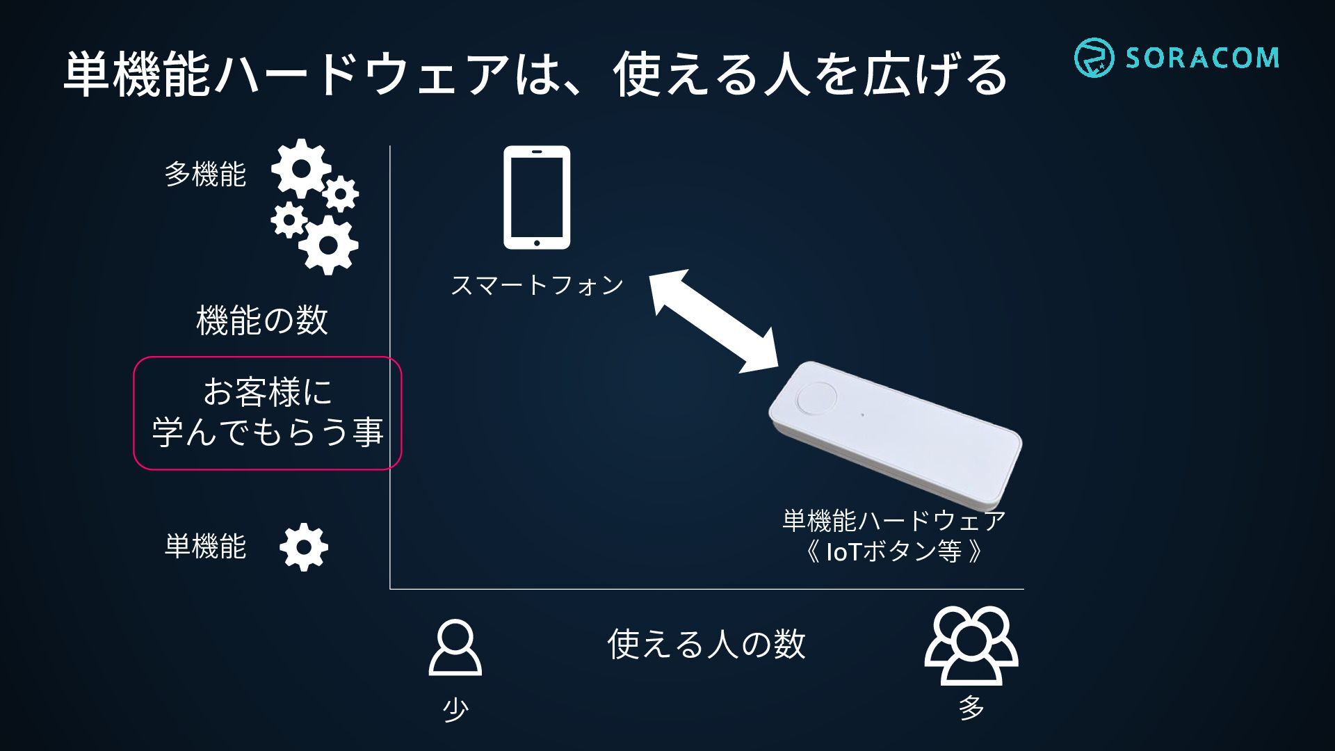 単機能ハードウェアは、使える人を広げる 使える人の数 少 多 機能の数 単機能 多機能 スマートフォン 単機能ハードウェア 《
