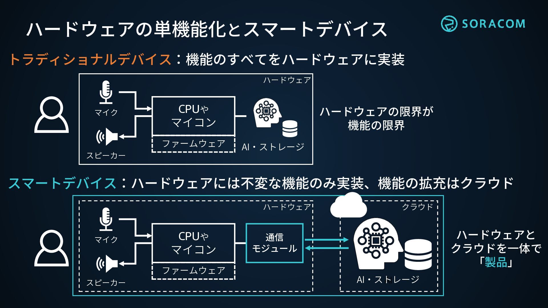 ハードウェアの単機能化とスマートデバイス CPUや マイコン 通信 モジュール ファームウェア スピーカー マイク AI スマートデバイス:ハードウェアには不変な機能のみ実装、機能の拡充はクラウド