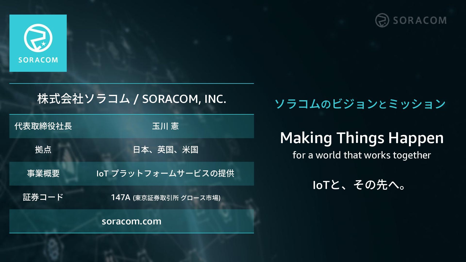 IoTと、その先へ。 株式会社ソラコム / SORACOM, INC. 代表取締役社長 玉川 憲 拠点 日本、英国、米国 事業概要 IoT プラットフォームサービスの提供 証券コード 147A (東京証券取引所 グロース市場) soracom.com