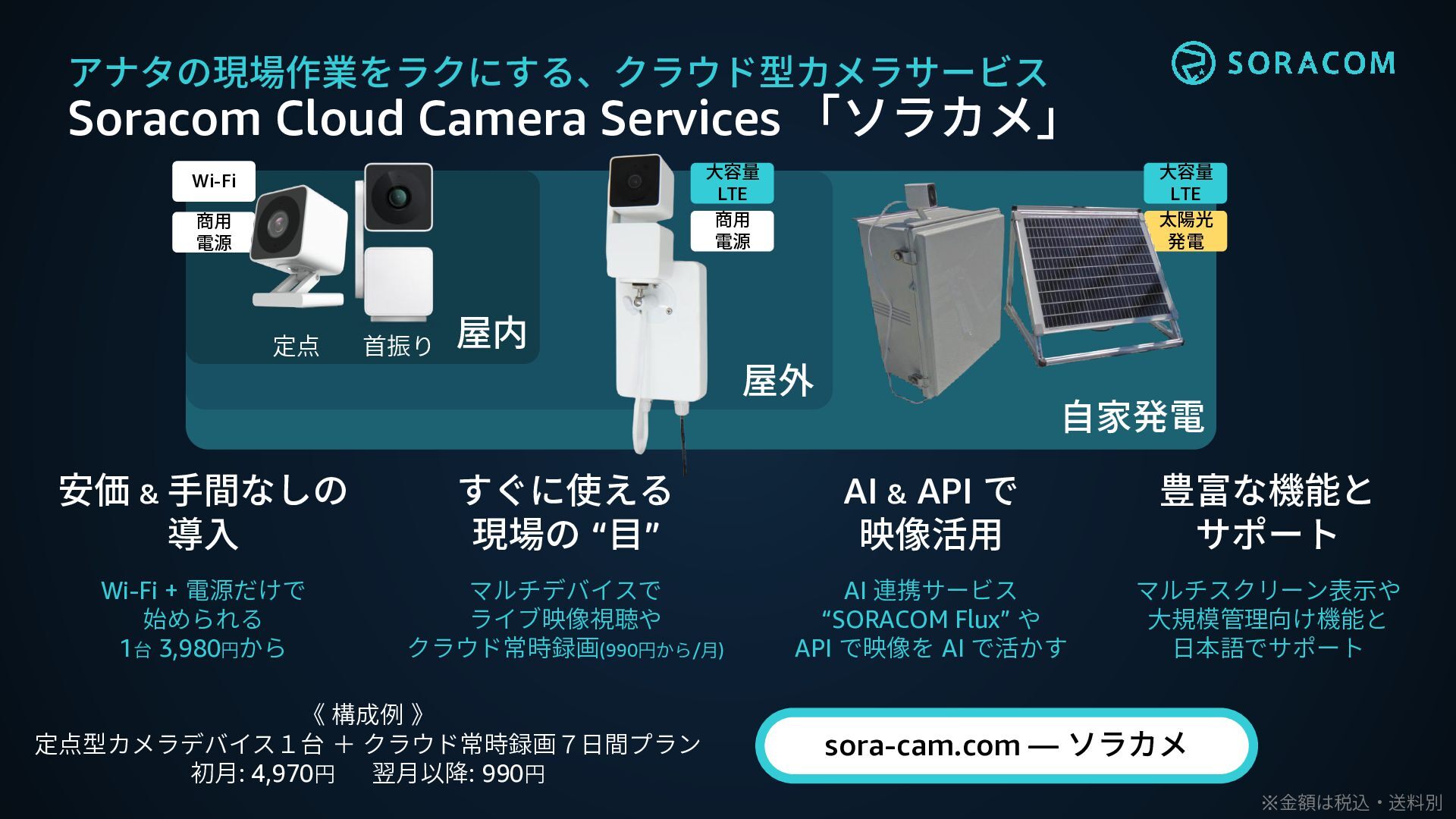 首振り Wi-Fi 商用 電源 大容量 LTE 商用 電源 大容量 LTE 太陽光 発電 屋内 屋外 自家発電 Wi-Fi + 電源だけで 始められる 1台 3,980円から 安価 & 手間なしの 導入 すぐに使える 現場の “目” マルチデバイスで ライブ映像視聴や クラウド常時録画(990円から/月) ※金額は税込・送料別 AI & API で 映像活用 AI 連携サービス “SORACOM Flux” や API で映像を AI で活かす 《 構成例 》 定点型カメラデバイス1台 + クラウド常時録画7日間プラン 初月: 4,970円 翌月以降: 990円 豊富な機能と サポート マルチスクリーン表示や 大規模管理向け機能と 日本語でサポート