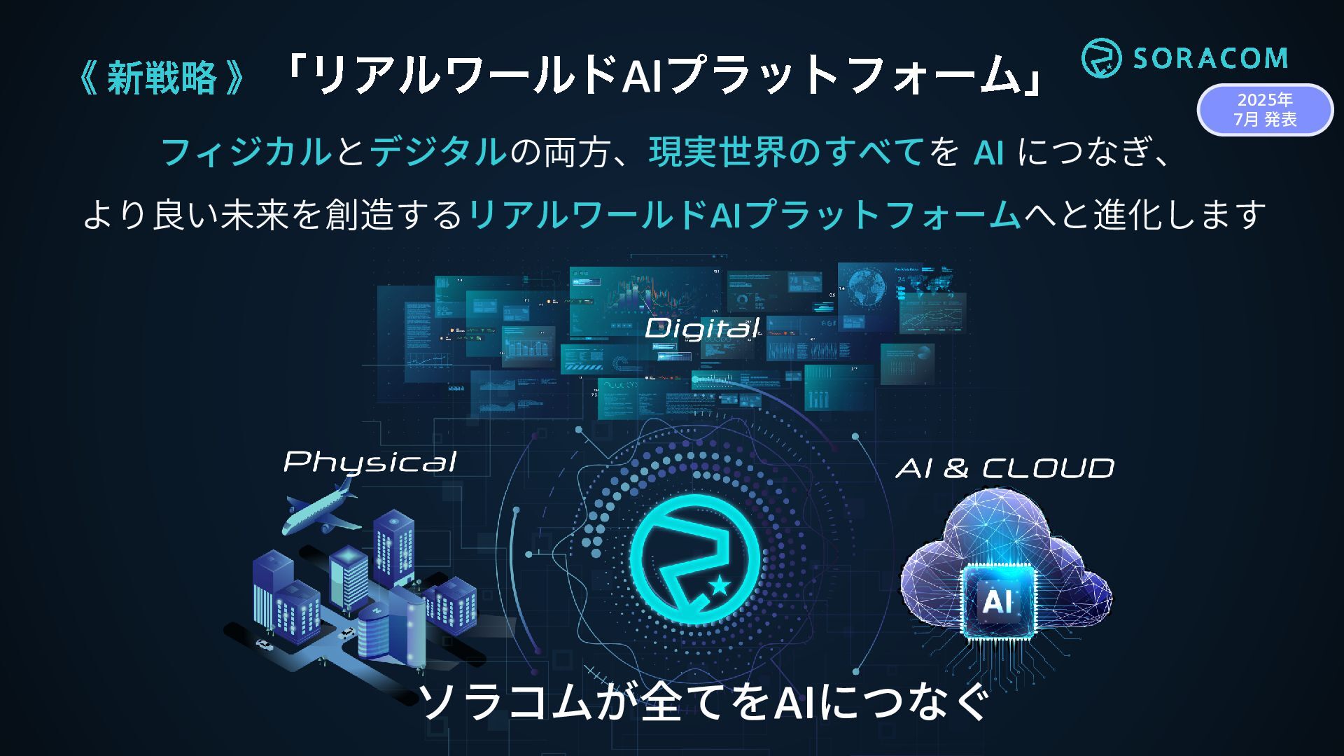 《 新戦略 》 「リアルワールド AIプラットフォーム」 フィジカルとデジタルの両方、現実世界のすべてを AI につなぎ、 より良い未来を創造するリアルワールドAIプラットフォームへと進化します ソラコムが全てをAIにつなぐ