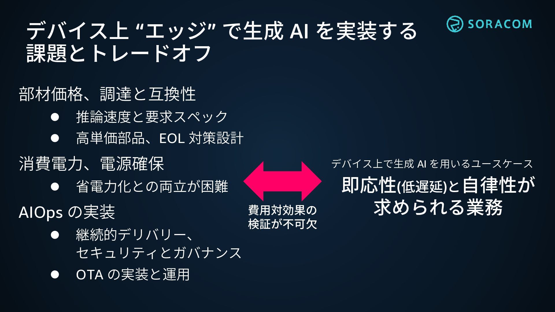 高単価部品、EOL 対策設計 消費電力、電源確保 ⚫ 省電力化との両立が困難 AIOps の実装 ⚫ 継続的デリバリー、 セキュリティとガバナンス ⚫ OTA の実装と運用 費用対効果の 検証が不可欠 デバイス上で生成 AI を用いるユースケース 即応性(低遅延)と自律性が 求められる業務
