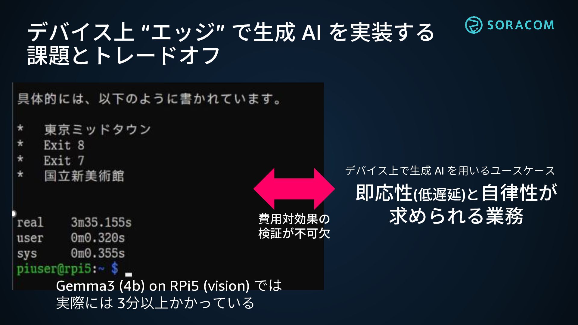 (vision) では 実際には 3分以上かかっている 即応性(低遅延)と自律性が 求められる業務 費用対効果の 検証が不可欠 デバイス上で生成 AI を用いるユースケース