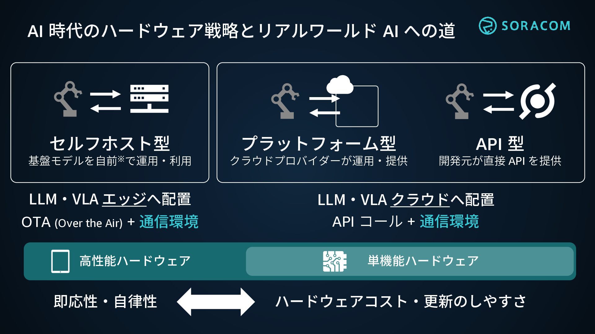 開発元が直接 API を提供 LLM・VLA エッジへ配置 OTA (Over the Air) + 通信環境 LLM・VLA クラウドへ配置 API コール + 通信環境 高性能ハードウェア 単機能ハードウェア ハードウェアコスト・更新のしやすさ 即応性・自律性