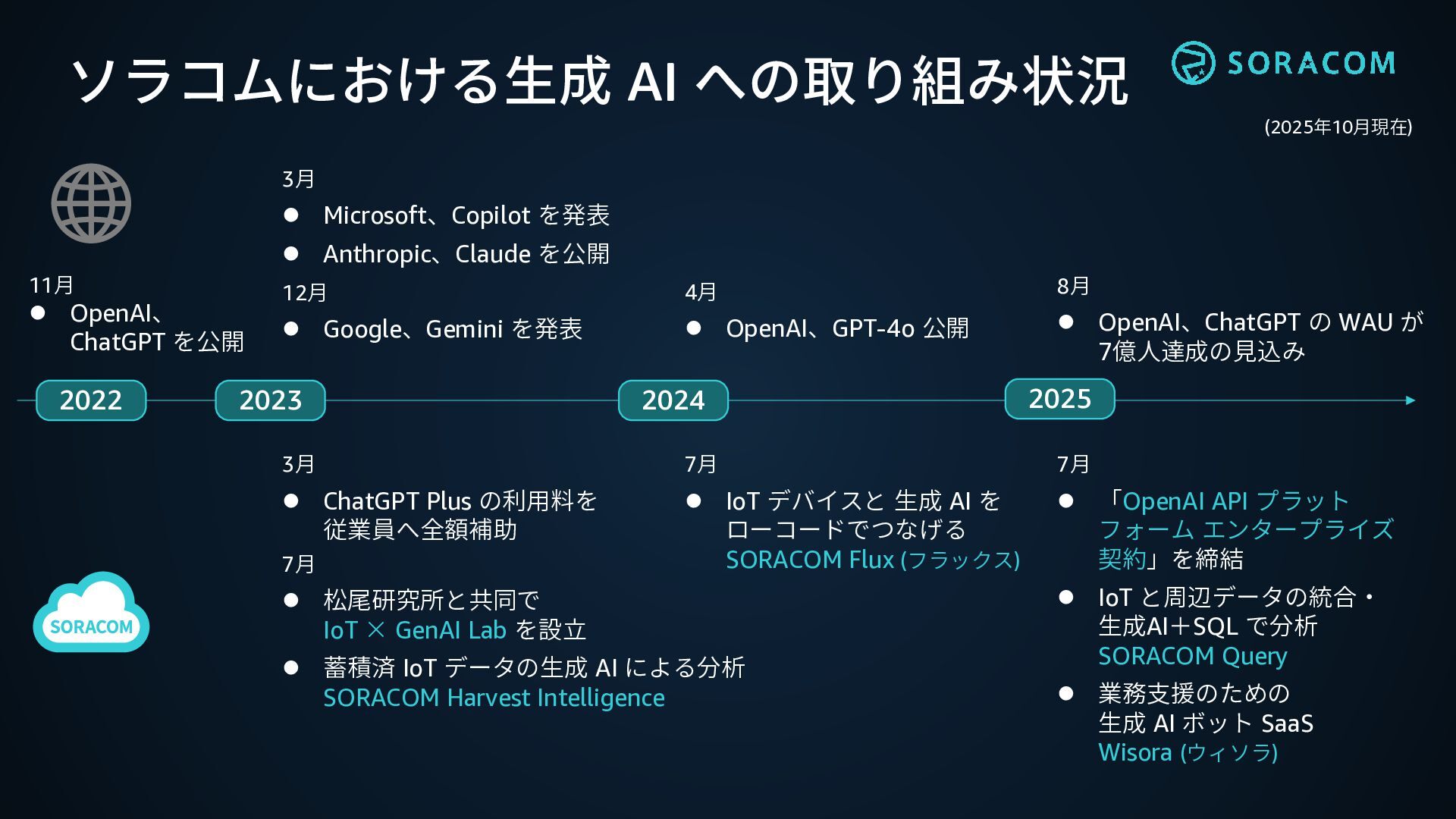 ⚫ 松尾研究所と共同で IoT × GenAI Lab を設立 ⚫ 蓄積済 IoT データの生成 AI による分析 SORACOM Harvest Intelligence 2025 2022 11月 ⚫ OpenAI、 ChatGPT を公開 3月 ⚫ Microsoft、Copilot を発表 ⚫ Anthropic、Claude を公開 7月 ⚫ IoT デバイスと 生成 AI を ローコードでつなげる SORACOM Flux (フラックス) 12月 ⚫ Google、Gemini を発表 4月 ⚫ OpenAI、GPT-4o 公開 8月 ⚫ OpenAI、ChatGPT の WAU が 7億人達成の見込み 2023 2024 7月 ⚫ 「OpenAI API プラット フォーム エンタープライズ 契約」を締結 ⚫ IoT と周辺データの統合・ 生成AI+SQL で分析 SORACOM Query ⚫ 業務支援のための 生成 AI ボット SaaS Wisora (ウィソラ) (2025年10月現在)