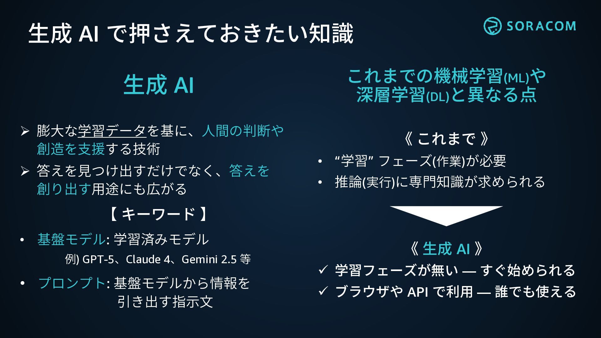➢ 答えを見つけ出すだけでなく、答えを 創り出す用途にも広がる 【 キーワード 】 • 基盤モデル: 学習済みモデル 例) GPT-5、Claude 4、Gemini 2.5 等 • プロンプト: 基盤モデルから情報を 引き出す指示文 《 これまで 》 • “学習” フェーズ(作業)が必要 • 推論(実行)に専門知識が求められる 《 生成 AI 》 ✓ 学習フェーズが無い ― すぐ始められる ✓ ブラウザや API で利用 ― 誰でも使える