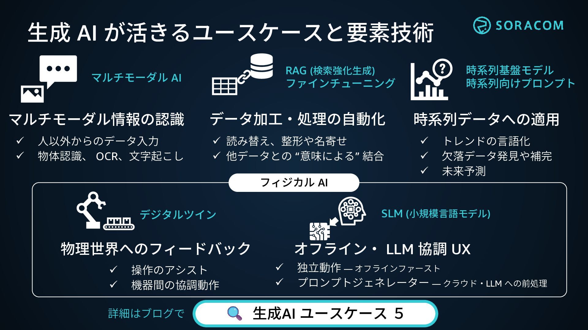 独立動作 ― オフラインファースト ✓ プロンプトジェネレーター ― クラウド・LLM への前処理 オフライン・ LLM 協調 UX 物理世界へのフィードバック ✓ 操作のアシスト ✓ 機器間の協調動作 データ加工・処理の自動化 ✓ 読み替え、整形や名寄せ ✓ 他データとの “意味による” 結合 時系列データへの適用 ✓ トレンドの言語化 ✓ 欠落データ発見や補完 ✓ 未来予測 生成AI ユースケース 5 詳細はブログで マルチモーダル AI RAG (検索強化生成) ファインチューニング 時系列基盤モデル 時系列向けプロンプト デジタルツイン SLM (小規模言語モデル) フィジカル AI