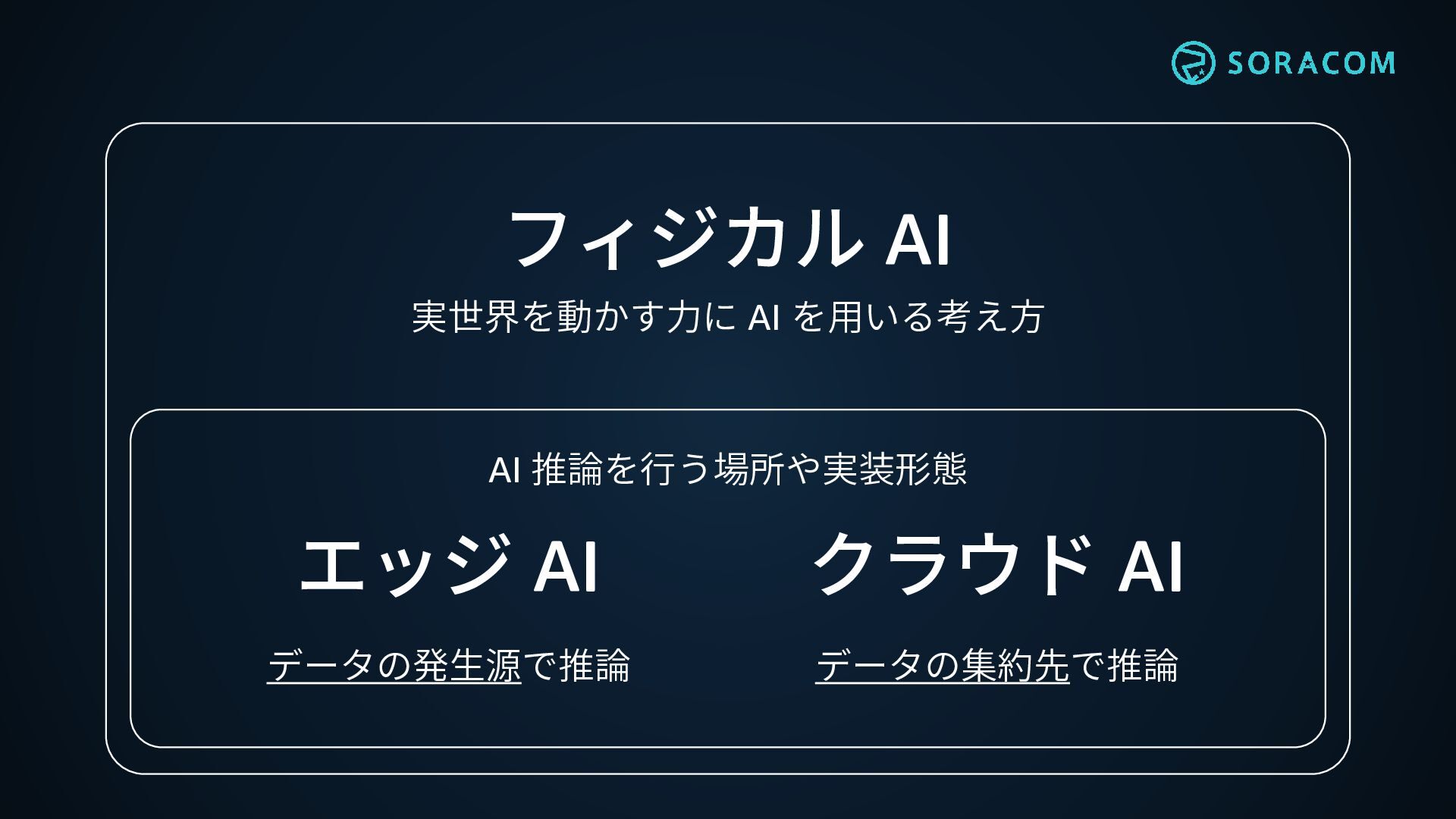 エッジ AI クラウド AI 実世界を動かす力に AI を用いる考え方 AI 推論を行う場所や実装形態 データの発生源で推論