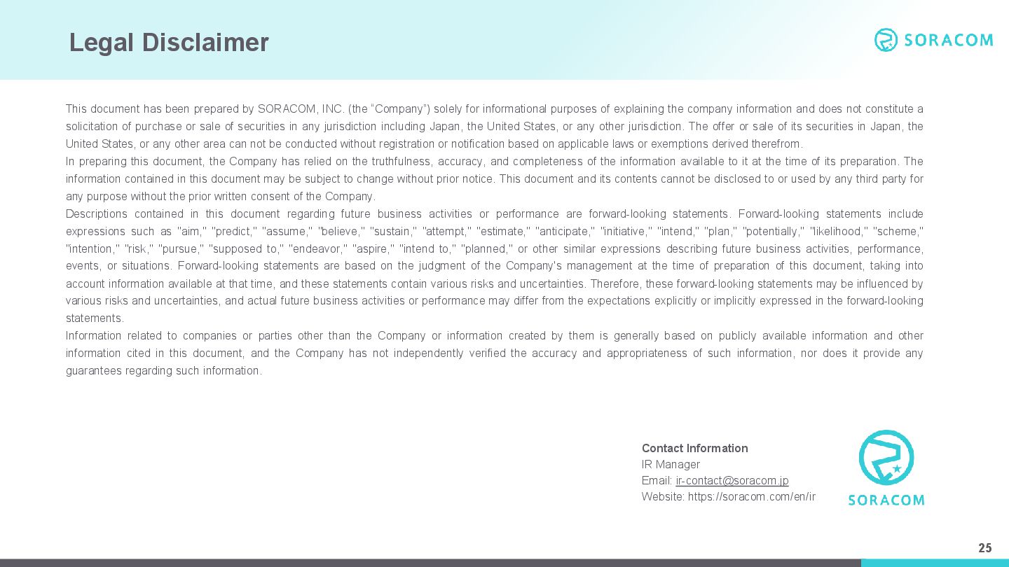 INC. (the “Company”) solely for informational purposes of explaining the company information and does not constitute a solicitation of purchase or sale of securities in any jurisdiction including Japan, the United States, or any other jurisdiction. The offer or sale of its securities in Japan, the United States, or any other area can not be conducted without registration or notification based on applicable laws or exemptions derived therefrom. In preparing this document, the Company has relied on the truthfulness, accuracy, and completeness of the information available to it at the time of its preparation. The information contained in this document may be subject to change without prior notice. This document and its contents cannot be disclosed to or used by any third party for any purpose without the prior written consent of the Company. Descriptions contained in this document regarding future business activities or performance are forward-looking statements. Forward-looking statements include expressions such as "aim," "predict," "assume," "believe," "sustain," "attempt," "estimate," "anticipate," "initiative," "intend," "plan," "potentially," "likelihood," "scheme," "intention," "risk," "pursue," "supposed to," "endeavor," "aspire," "intend to," "planned," or other similar expressions describing future business activities, performance, events, or situations. Forward-looking statements are based on the judgment of the Company's management at the time of preparation of this document, taking into account information available at that time, and these statements contain various risks and uncertainties. Therefore, these forward-looking statements may be influenced by various risks and uncertainties, and actual future business activities or performance may differ from the expectations explicitly or implicitly expressed in the forward-looking statements. Information related to companies or parties other than the Company or information created by them is generally based on publicly available information and other information cited in this document, and the Company has not independently verified the accuracy and appropriateness of such information, nor does it provide any guarantees regarding such information. Contact Information IR Manager Email: