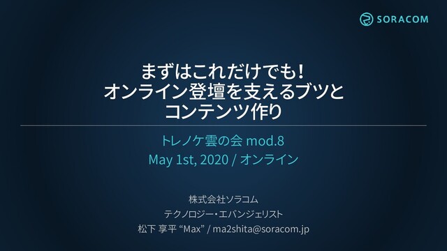5/1/2020 トレノケ雲の会 mod.8 リモート環境ジマンの会にて、ソラコムのテクノロジー・エバンジェリスト 松下(Max) より発表した資料。オンライン登壇における資料作成と配信設備を紹介しています。