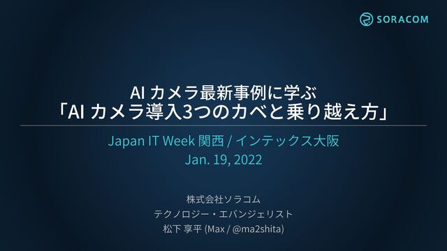 2022年1月19日(水)のJapan IT Week 関西 2022の特別講演にて、ソラコム松下が発表した「AIカメラ最新事例に学ぶ「AIカメラ導入3つのカベと乗り越え方」」の資料です。